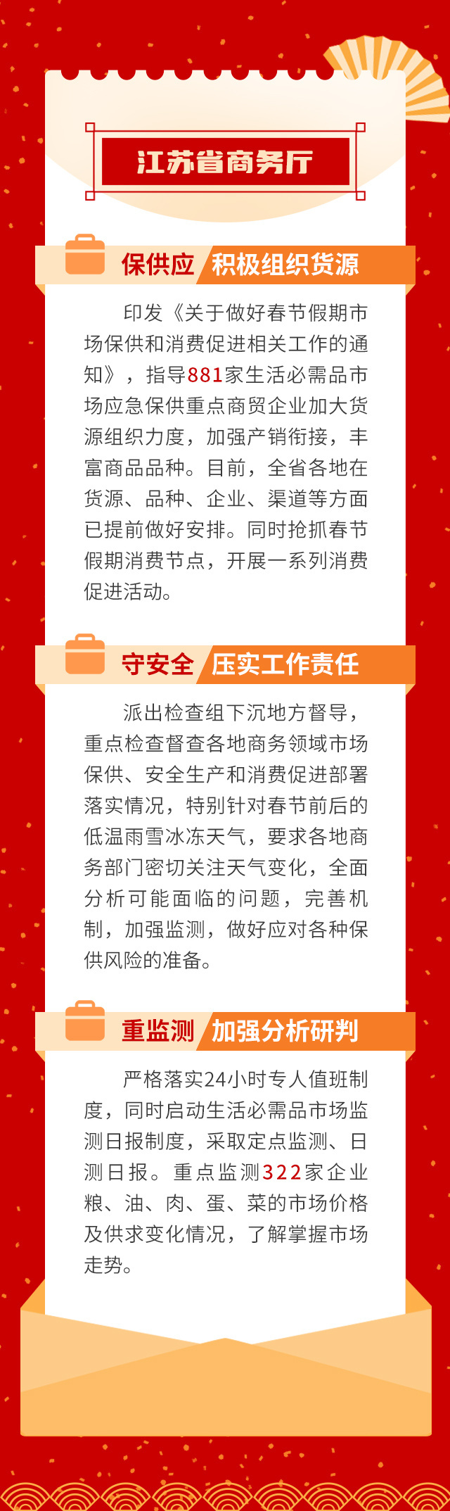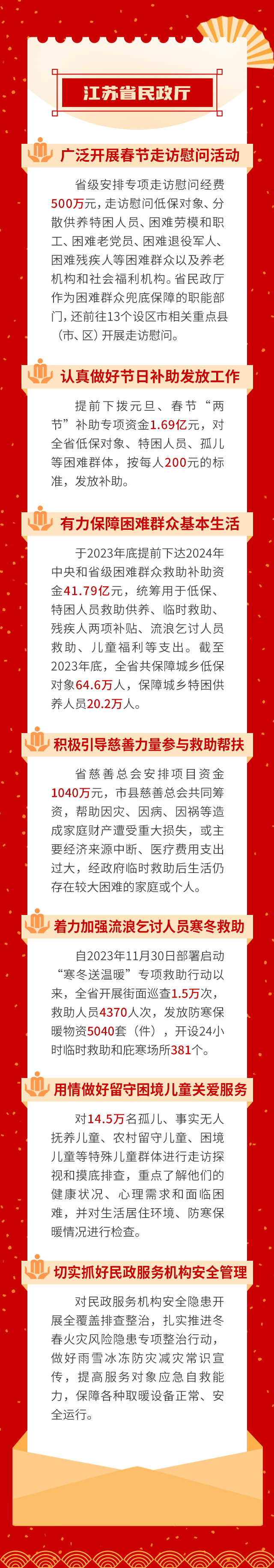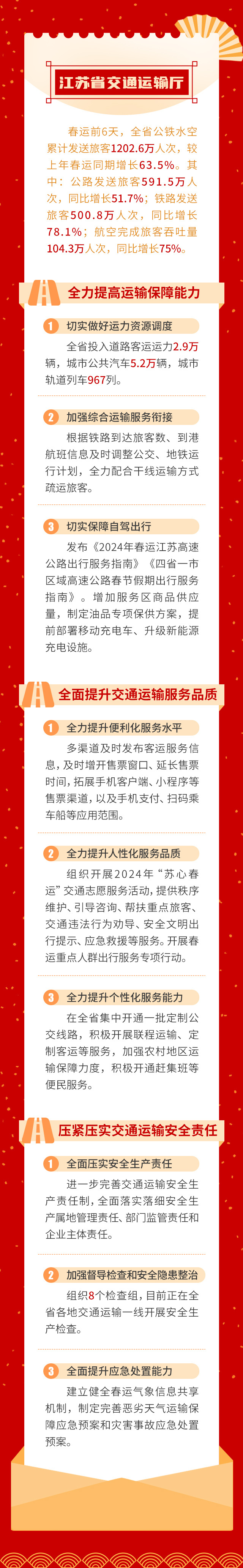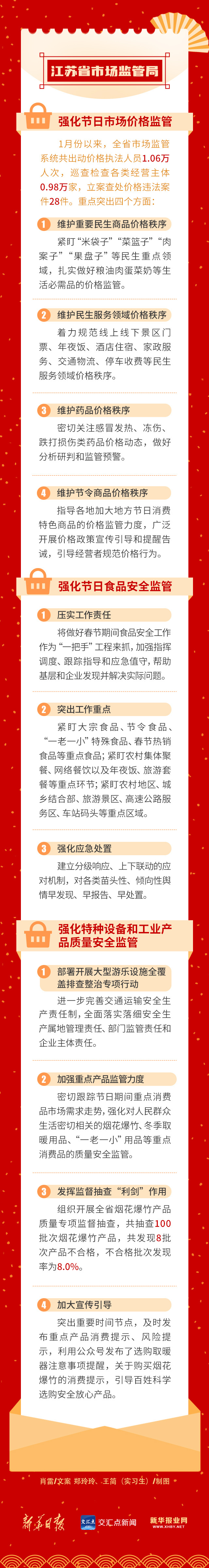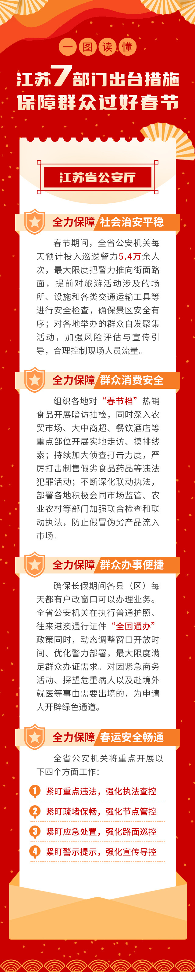 今天是2月2日,农历腊月二十三,距离春节越来越近。今天上午,江苏召开保障群众过好春节新闻发布会,省公安厅、省民政厅、省交通运输厅、省商务厅、省文化和旅游厅、省卫生健康委、省市场监管局等7部门介绍了保障群众过好春节的具体措施。交汇点新闻带你一图了解——