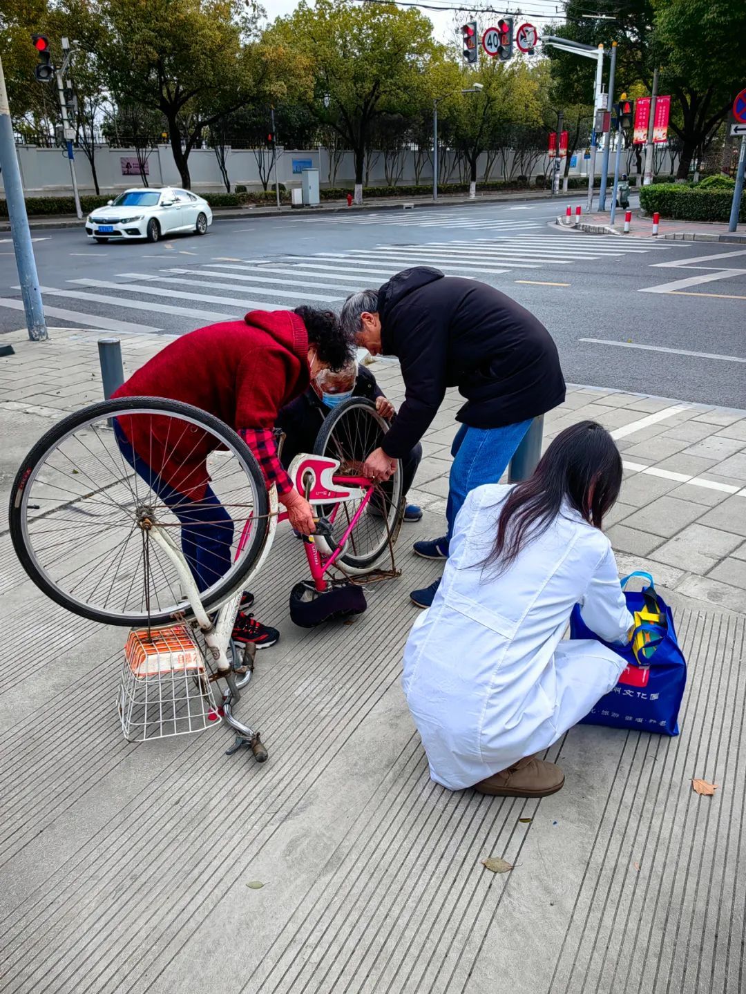 与此同时,服务站的其他工作人员也自发提供帮助。工作人员们将老人的自行车抬到路边,站点保洁阿姨发现自行车无法正常骑行,便立即拿出工具进行修理。一些热心居民也主动加入协助调整自行车龙头等部件。