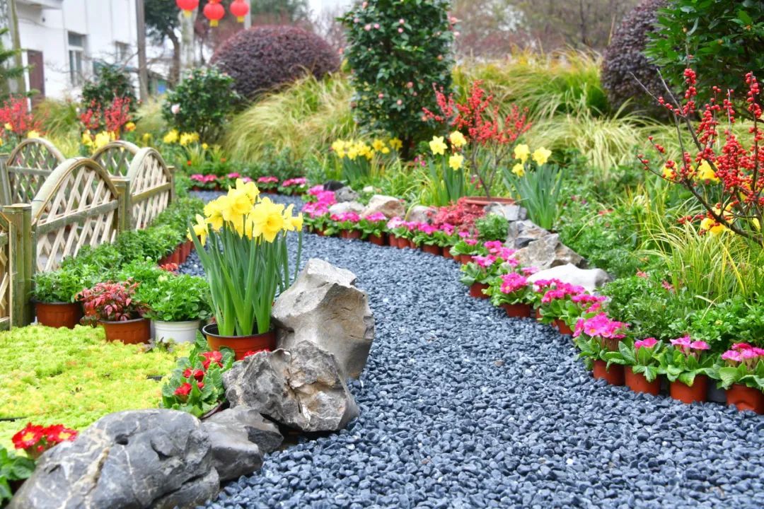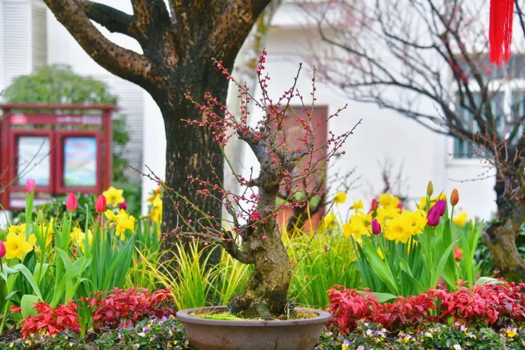 此次花展还准备了三十几盆腊梅盆景和三处小型景点烘托氛围。公园主题花坛围绕现有的3株梅花老桩,辅以郁金香、洋水仙、报春花等时令花卉。花坛相邻的梅花主题广场用竹篱笆围出的区域内,用造型黑松、造型无刺枸骨、火焰南天竹、美国香茶、北美冬青及南洋杉形成骨架,提高区域观赏性。公园主题花坛的右侧,通过时令花卉进行点缀布置,进一步烘托迎接新年的氛围,让游客在赏梅的同时,热热闹闹欢度新春佳节。