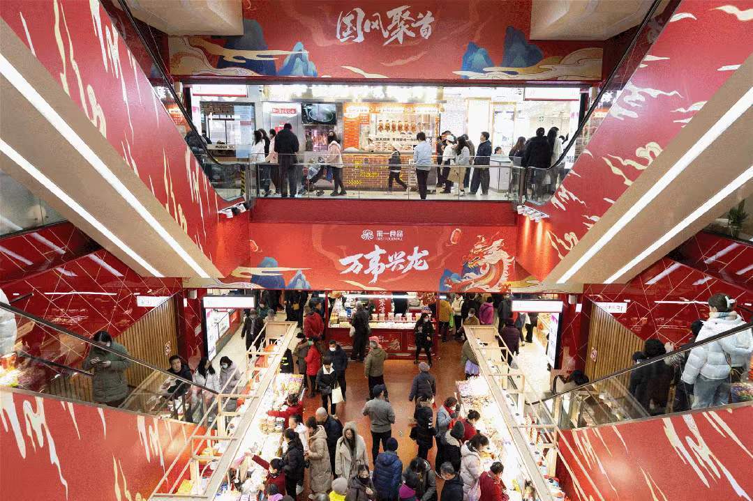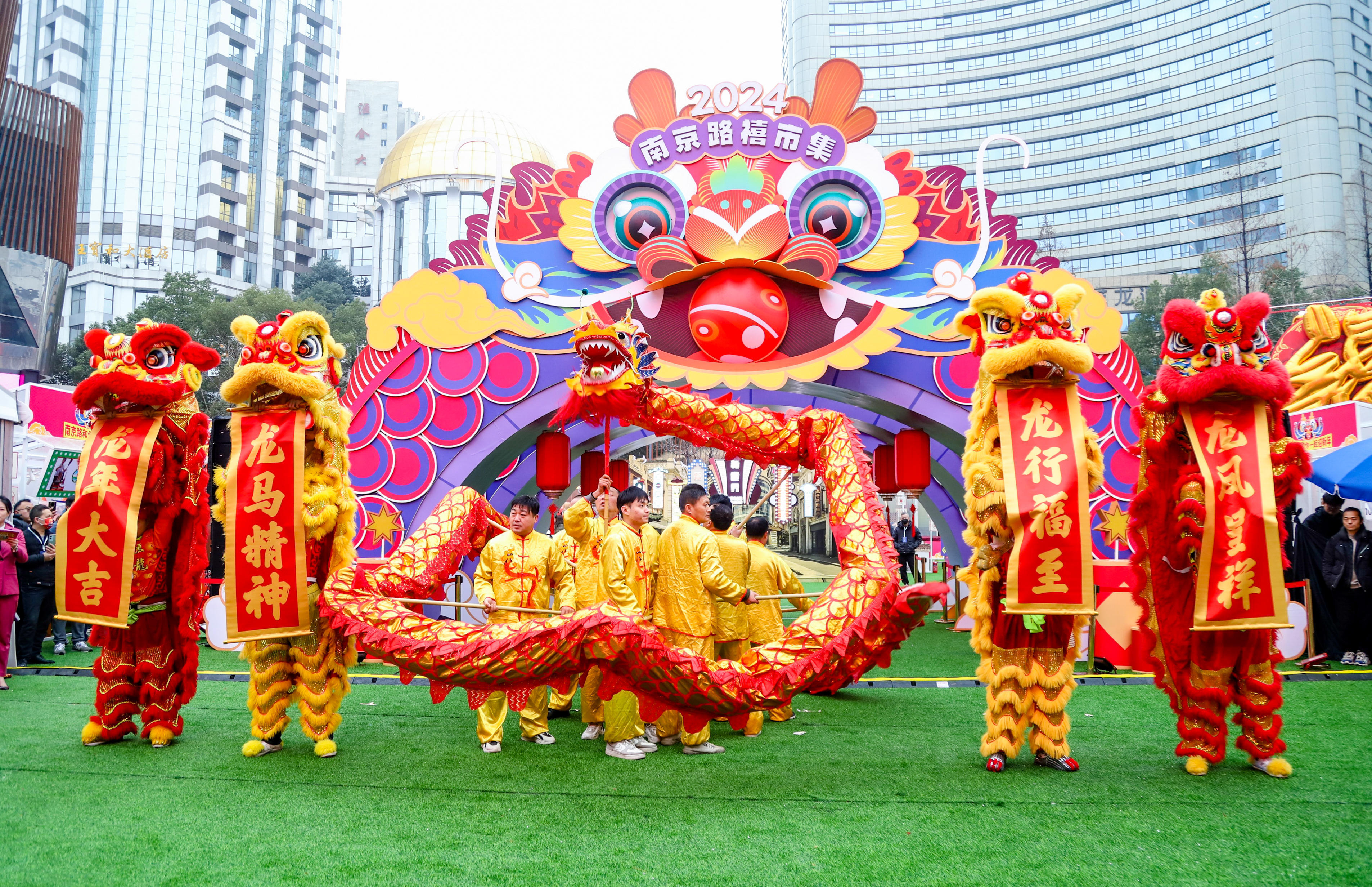 南京路步行街“含龙量”飙升,迎新氛围感“拉满”!充满烟火气的“龙行福至”2024南京路禧市集火热开市。步行街上各家商场、老字号商店布置一新,各种龙元素装置和商品“花式”亮相。