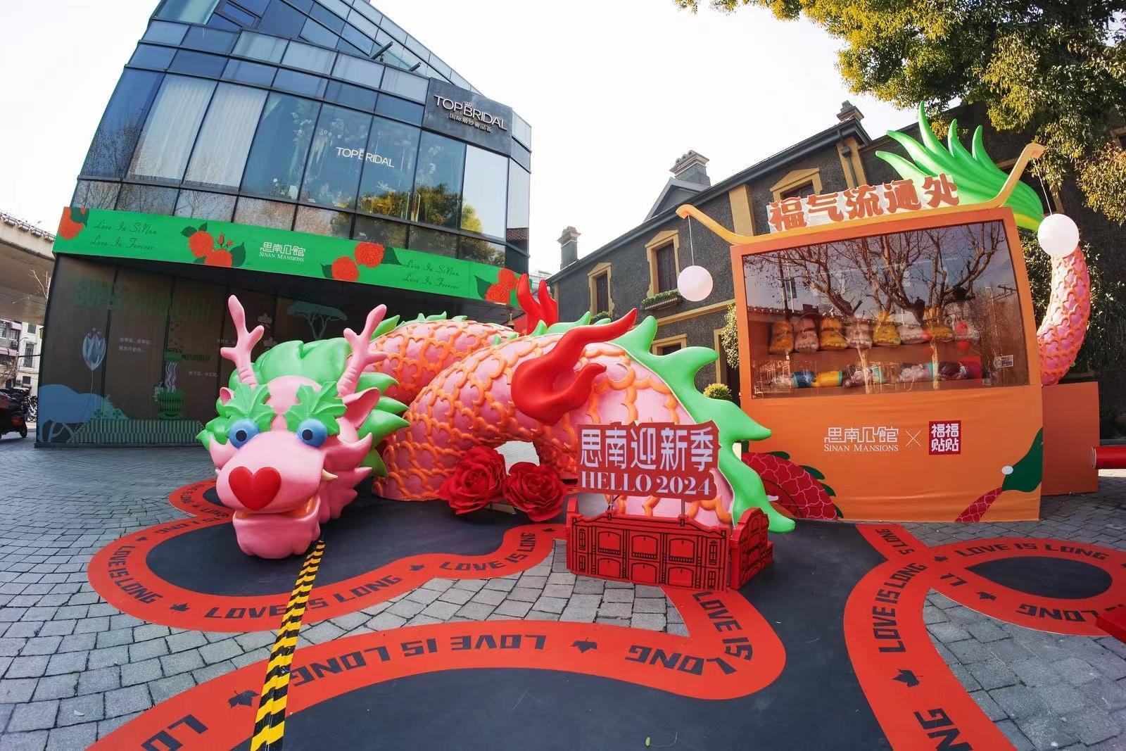 已连续举办8年的思南迎新季再启“小高潮”,灵感来源于中国传统瓷瓶的巨型萌龙形象龙年迎新装置,以及位于思南花墙广场的一整面以古代传说中的飞龙为设计灵感的绿植打卡墙,为市民游客带来新春美好体验。