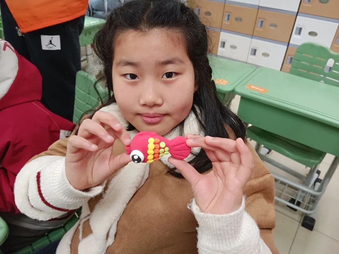 从构思到选色,捏型到拼接,最后再进行鱼鳞的细致雕刻,孩子们发挥着无限的想象,制作出了红鲤鱼、小丑鱼、小章鱼等一个个尽显童心与活力的作品。