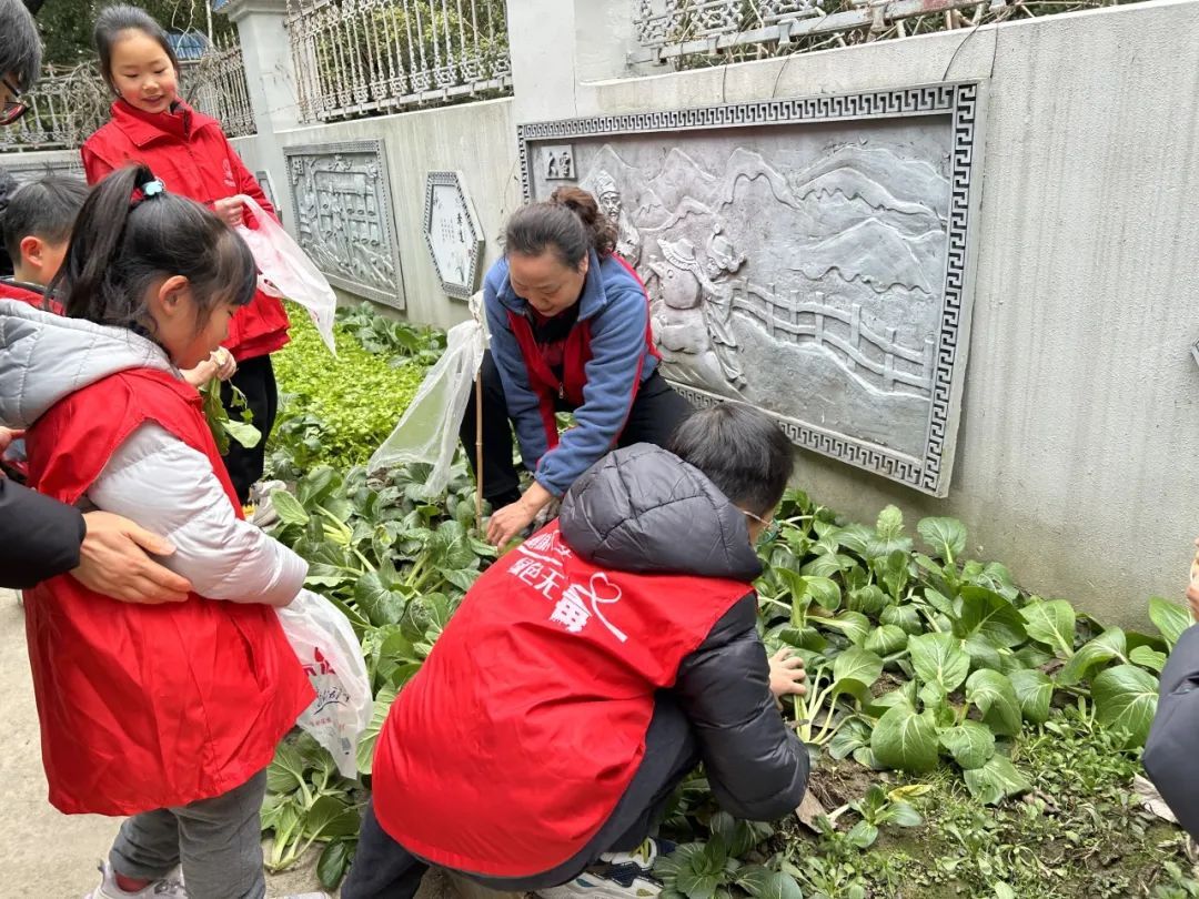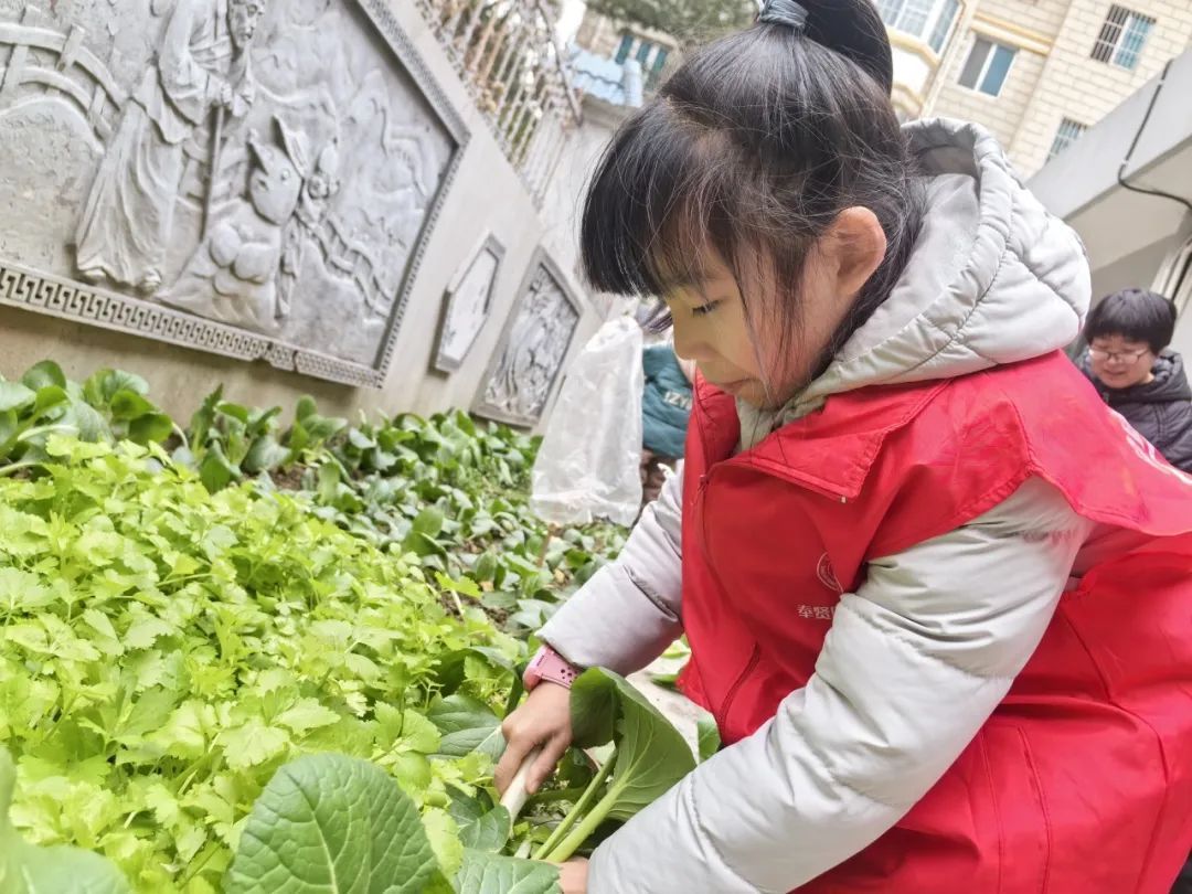 入户探访前,由居委工作人员带领亲子志愿者们来到幸福大院303的“一米菜园”,在“一米菜园”的志愿管理员——杜阿姨的指导下采摘新鲜蔬菜,准备为独居老人们送上他们丰硕的劳动成果。