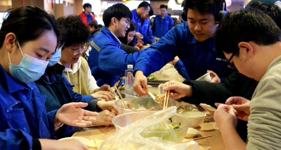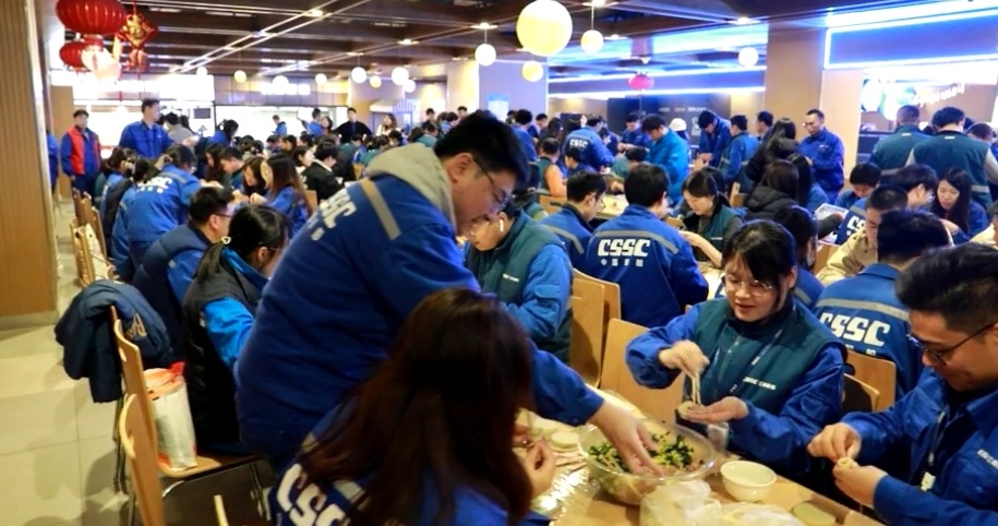 位于崇明长兴岛的江南造船(集团)有限责任公司拥有职工3万多名,这些职工来自祖国各地,大家汇聚于此,为一艘艘国产巨轮贡献力量。春节临近,他们其中有不少人还需坚守岗位,留沪过年。日前,江南造船党委工作部组织留沪职工开展了一场“包饺子”活动,给大家带来“年味”,送上祝福。