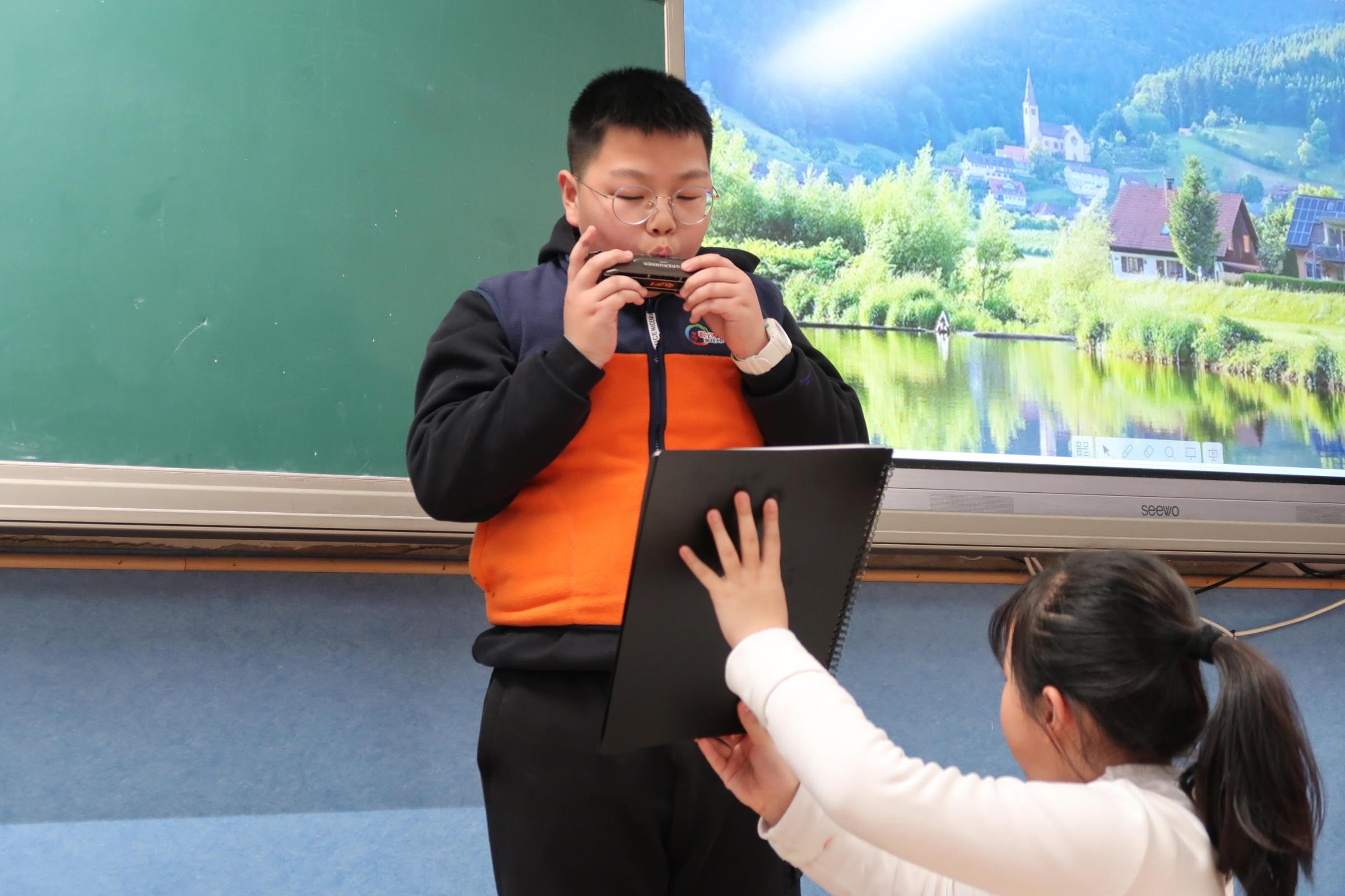 五年级的谭嘉谊小朋友学习非常认真,课后喜爱背古文的他在结业仪式上带来了口琴表演——《拉德斯基进行曲》。口琴声悠扬,旋律绵长而富有节奏,孩子们都一起安静聆听,感受乐曲的魅力。