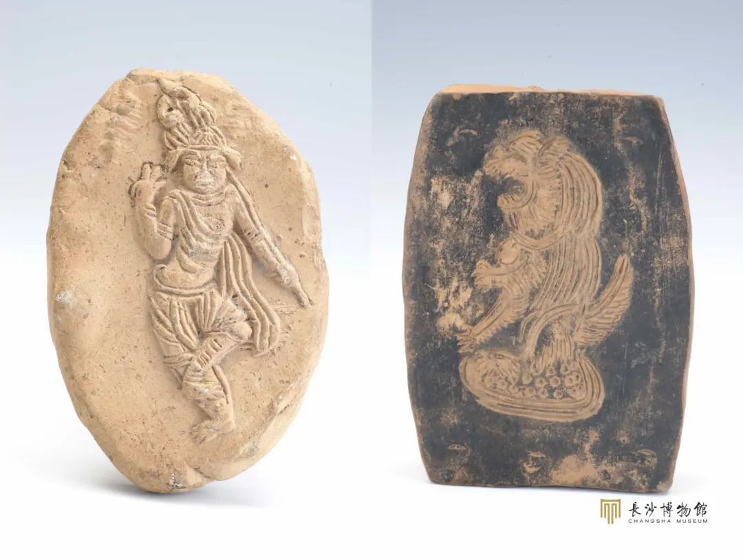 △唐长沙窑人物纹陶印模(左)和狮纹陶范