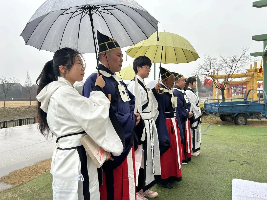 虽然天空下着小雨,但抵挡不住大家的热情,大家穿上汉服拿着彩仗,一一作揖,行迎春礼。