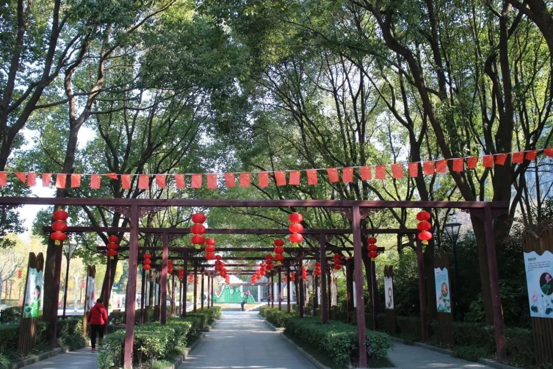 长风公园在四个门的入口、游船码头、水杉林等处布置了年味小品、花艺造型、灯笼装饰等营造节日氛围,表达对新年美好生活的期许和祝福。