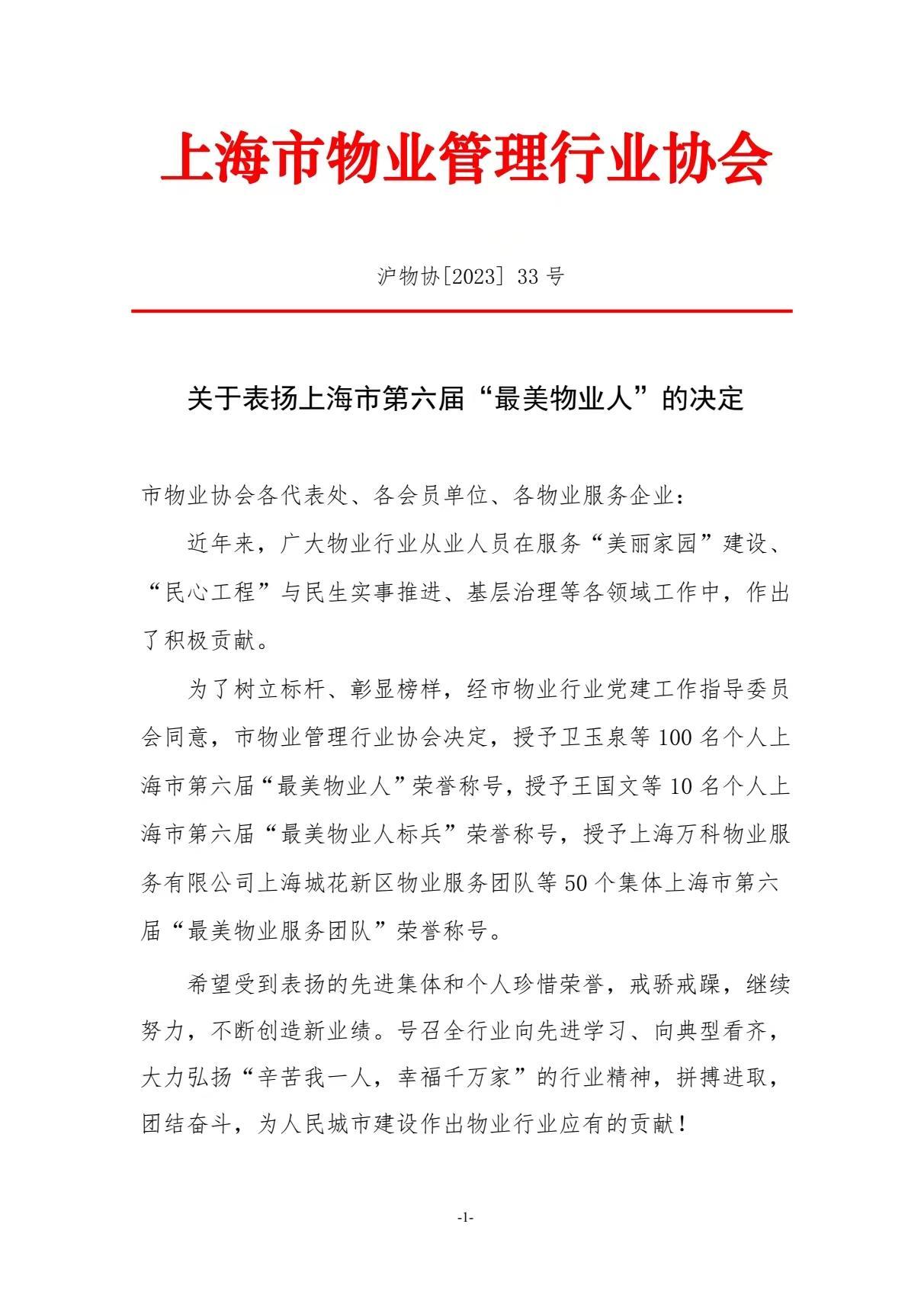 2023年,6个街道获得市“住宅物业类”热线工单处置先进、3人获得市2023年市最美物业人、1人获得市最美物业人标兵、6家单位获得市最美物业服务团队、2人获得市物业管理行业职业技能竞赛(上海物业工匠人)称号。(文后附名单)