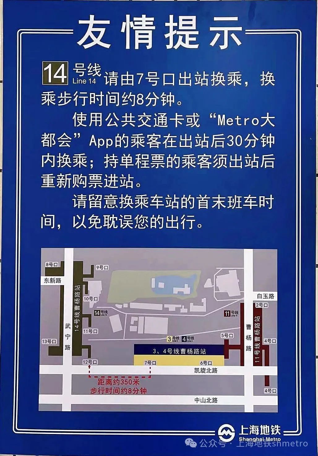 需要在3号线曹杨路站换乘14号线的乘客,需站外换乘,步行约8分钟。乘坐11号线的乘客可以直接在11号线真如站站内换乘14号线。
