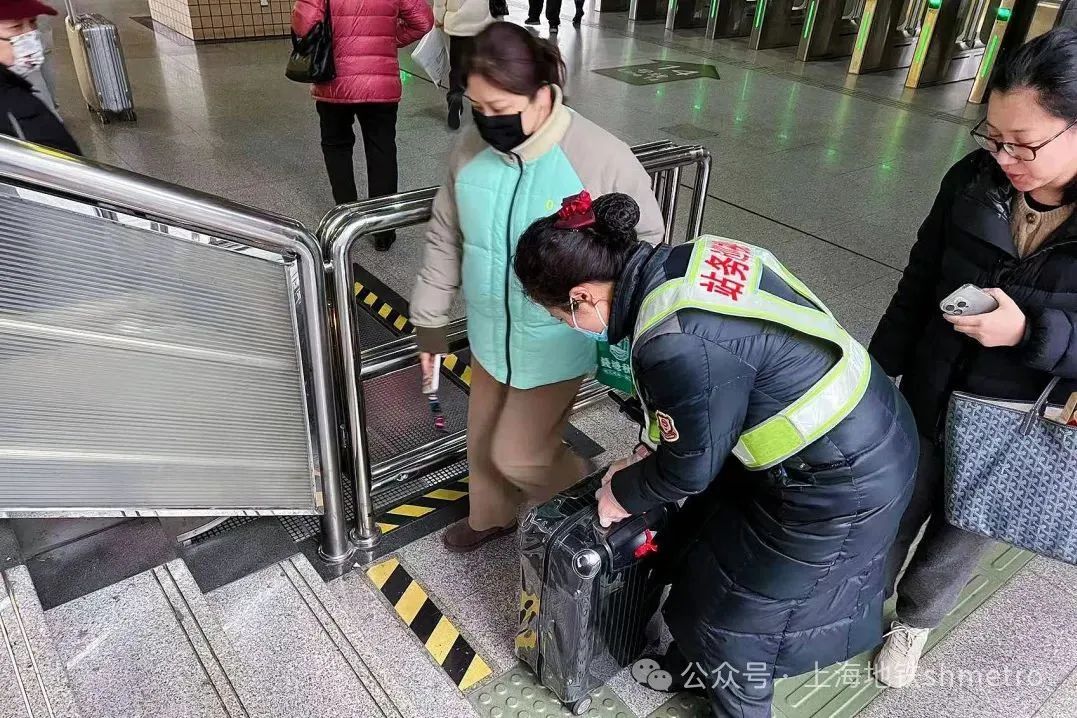 春运期间,为方便手提行李箱的乘客出行,车站主动为携带大件行李的乘客提供人力搬运服务,缩短乘客等候无障碍电梯的时间,也避免大件行李乘坐自动扶梯的隐患。