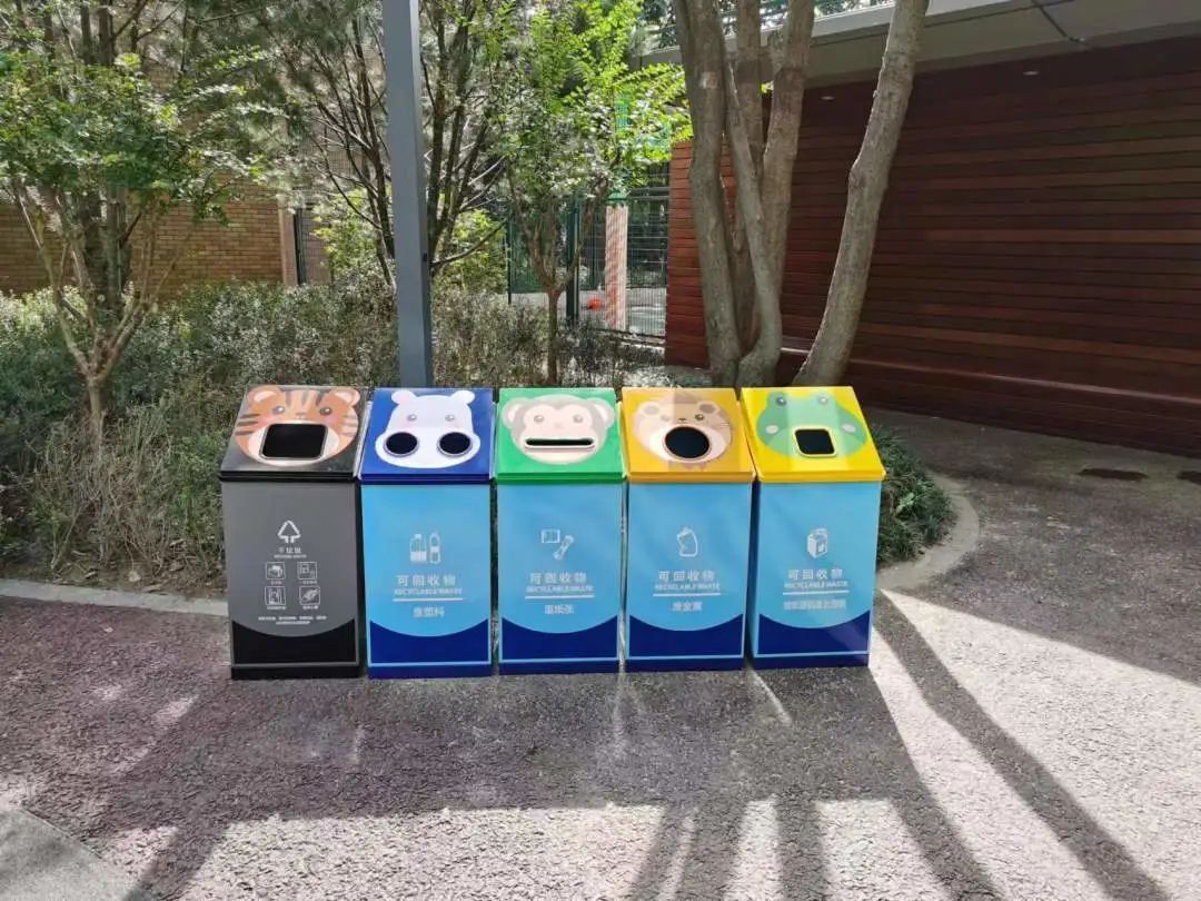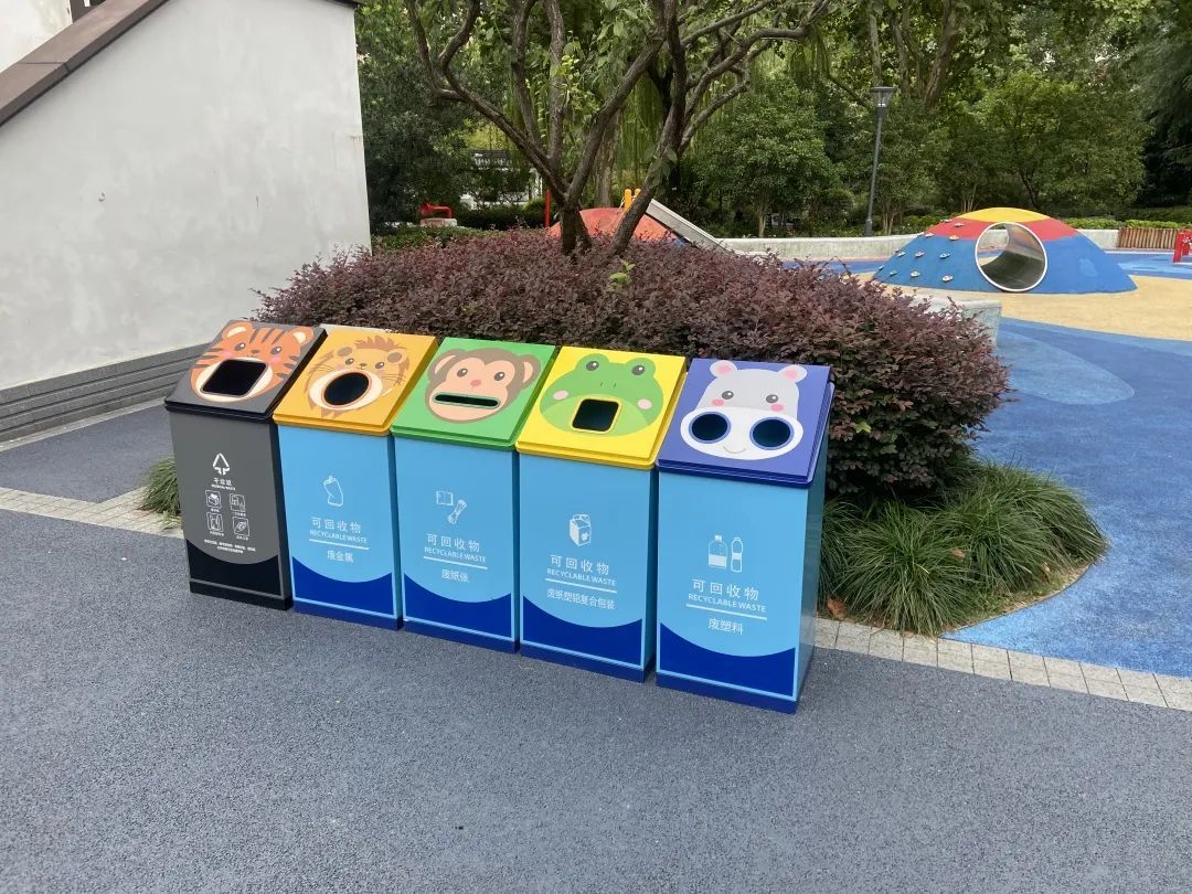 在各座公园中,废物箱细分为干垃圾、废金属、废纸张、废纸塑铝复合包装、废塑料,形状不一的投放口设计格外醒目;在公园儿童游乐区域,卡通造型的细分类废物箱同样也趣味十足。
