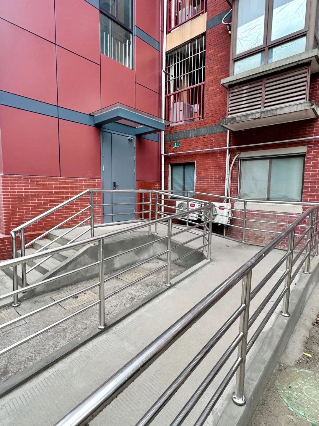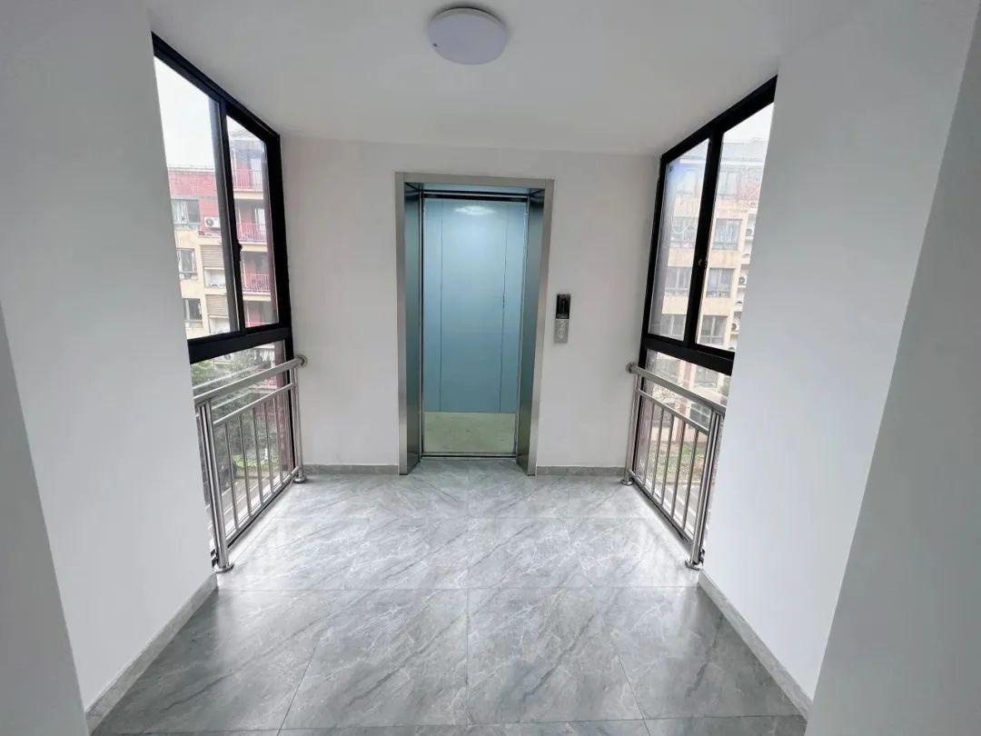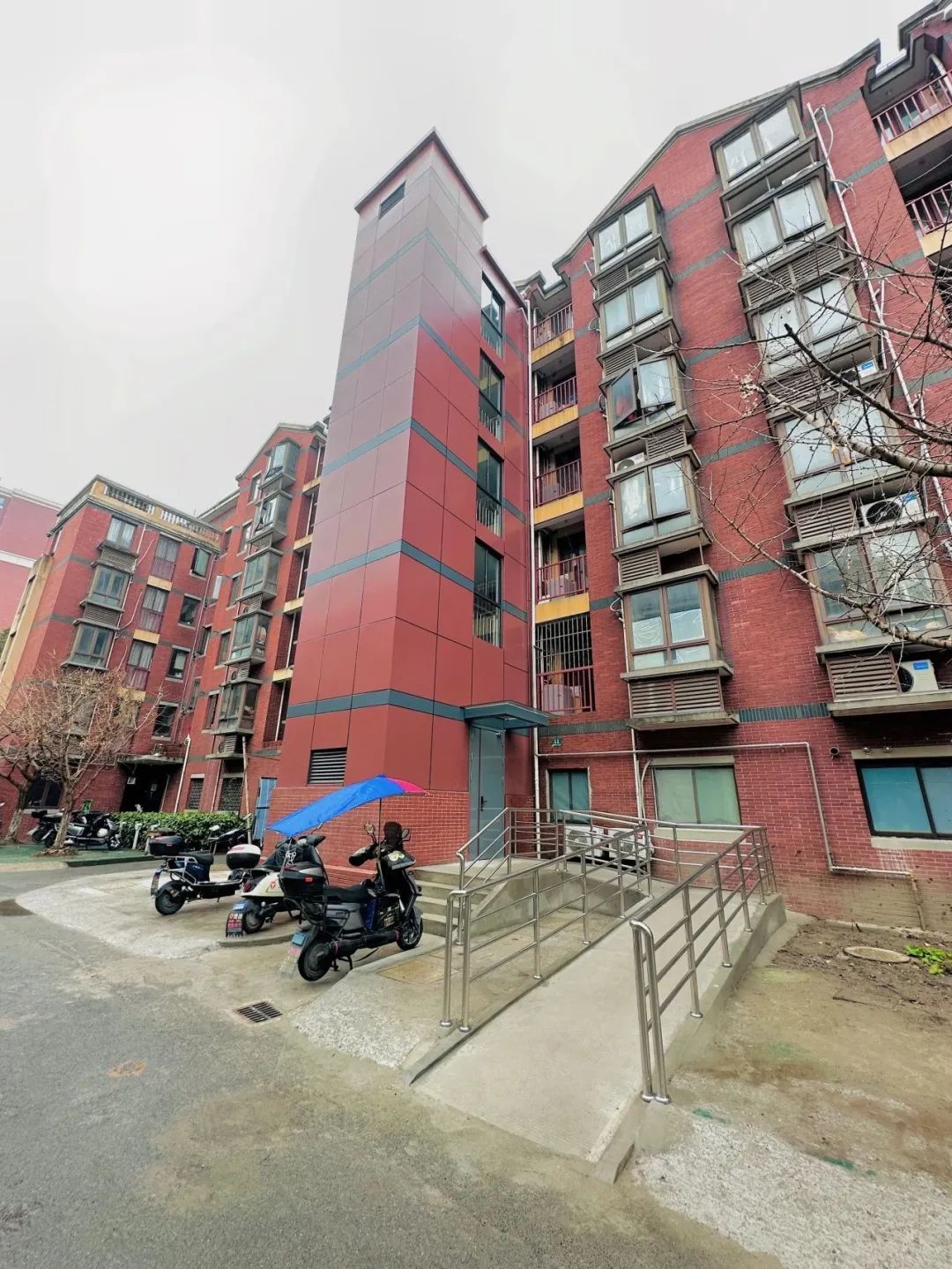 新电梯外铺设了宽敞的残疾人步道,安装了结实的防火防盗门,电梯厅的两面落地玻璃前设有防护栏杆,使得楼道采光明亮通透外不乏安全性。为了加装电梯后与原楼体形成良好的视觉效果,电梯外观采用与楼栋外墙相近的砖红色,并在底部铺贴红砖,使新电梯与原楼体自然衔接,浑然一体。