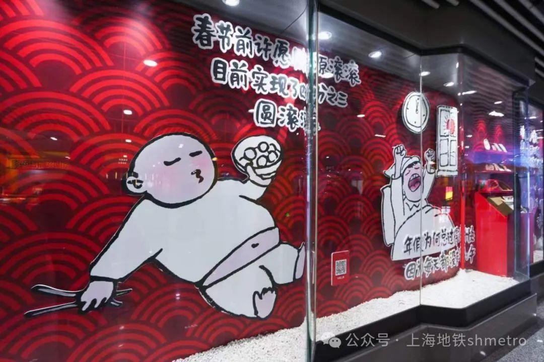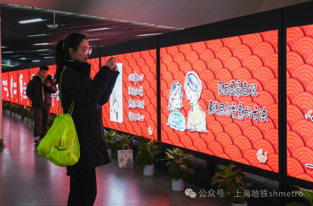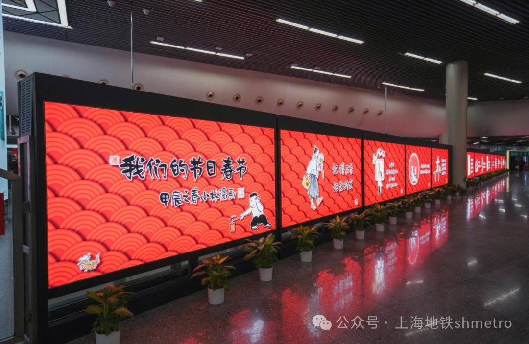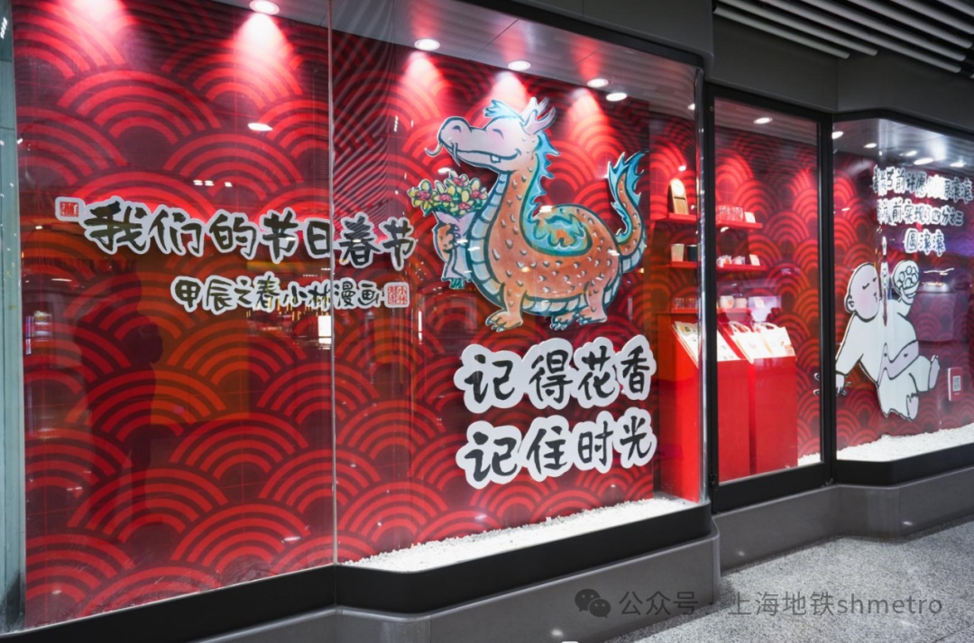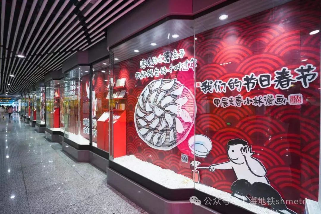 手捧鲜花的可爱龙、吃得圆滚滚的肚皮、妈妈包的大饺子、各类年味零食,快来和龙年春节标志性元素合影吧!在人民广场站和陕西南路站文化长廊,是由上海市精神文明建设委员会办公室主办的《我们的节日·春节》系列展览,展览精选了漫画家小林《幸福在生长》中的部分作品,聚焦春节主题,用可爱的形象和幽默的语言,描绘出现代人春节状态,令人会心一笑。乘客在经过橱窗时,仿佛能够看见“另一个自己”,引发共鸣。