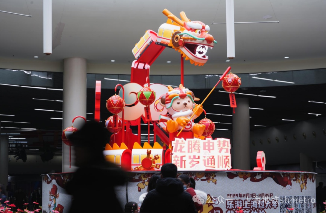 人民广场站中央展台的泰迪熊舞龙以“龙腾申势,新岁通顺”为主题,上海地铁列车化身瑞龙,为市民乘客送上新春美好的问候。该装置也是市文旅局2024年“寻龙记·乐游上海过大年 非遗新体验 ”活动的打卡点之一。从2月1日起至2月25日,上海过年的市民及游客在包括人民广场站在内的上海任意景区、商圈打卡或者自发上传各种新奇有趣的龙图、龙样、龙故事、龙手艺,共同发起规模最大的“寻龙”活动纪录挑战,还有机会获取上海地铁乘车折扣券。(具体打卡方式见:寻龙记微信文章链接)