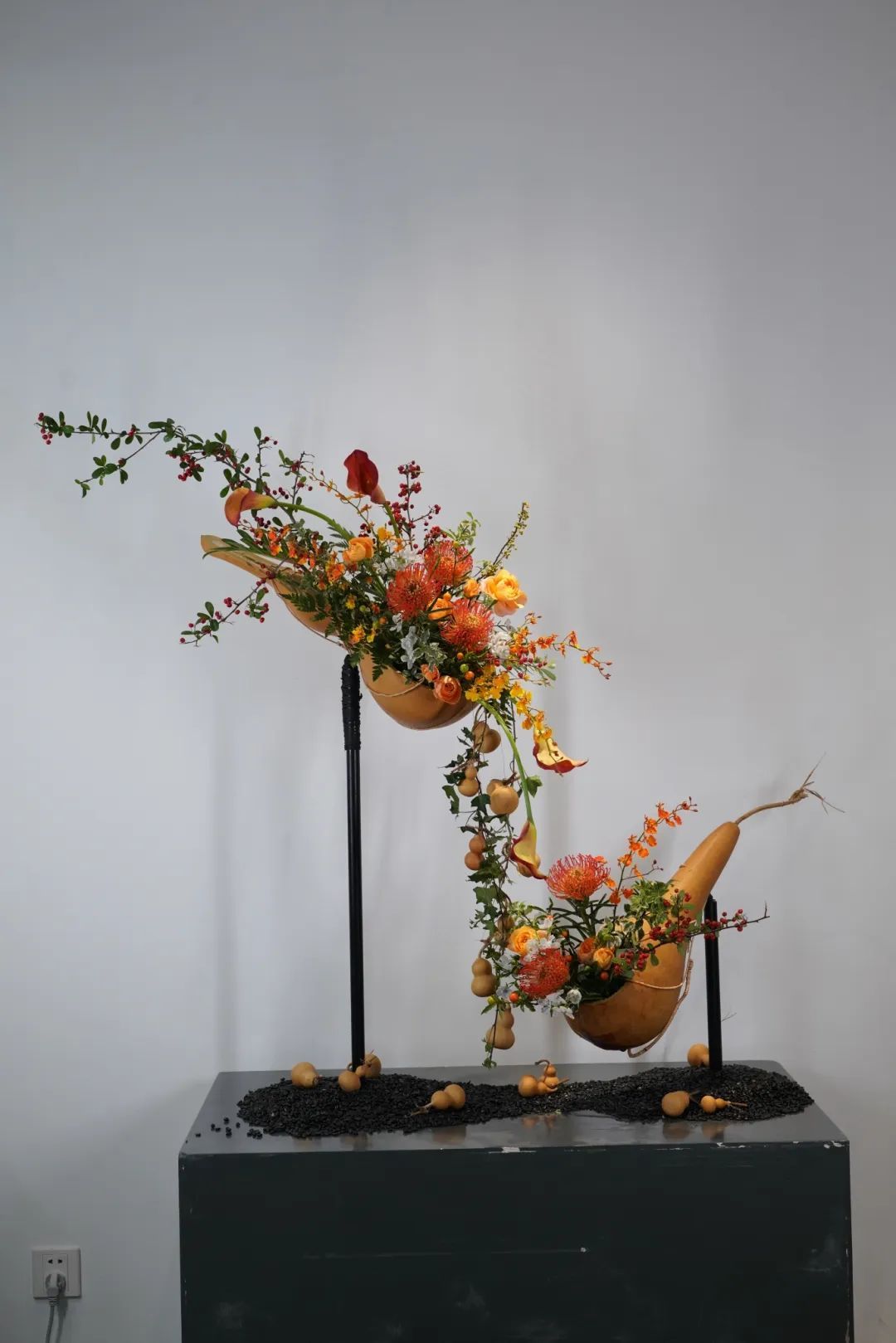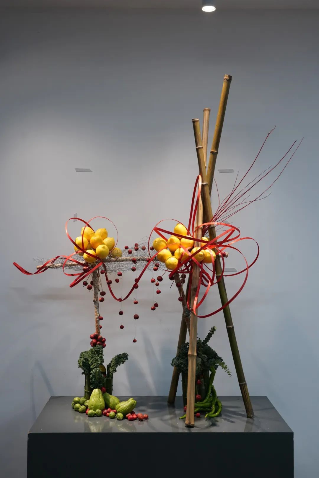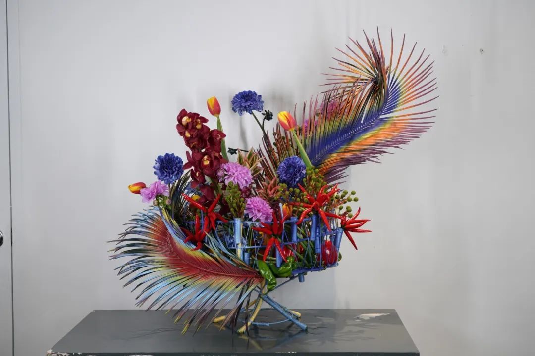 本次果蔬插花作品展结合中国传统插花瓶、篮、盘、碗、筒、缸六大器皿和家庭生活中的瓢盆锅。运用这些生活中的器皿,创作出不一样的艺术作品,造型别具一格的特色。