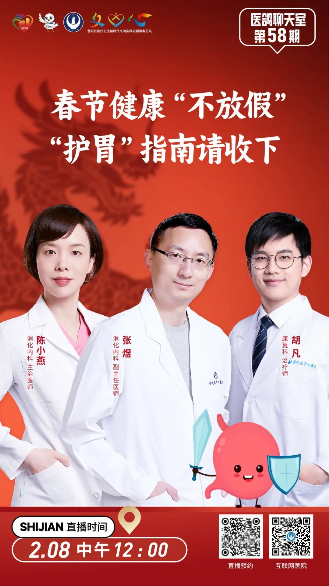 2月8日(周四)12:00,普陀区中心医院5G健康直播间将以《春节健康“不放假”,“护胃”指南请收下》为主题,由消化内科副主任医师张煜、主治医师陈小燕、康复科主管治疗师胡凡一起搭档,带你了解春节期间如何保护好自己的肠胃。观众朋友们不见不散!
