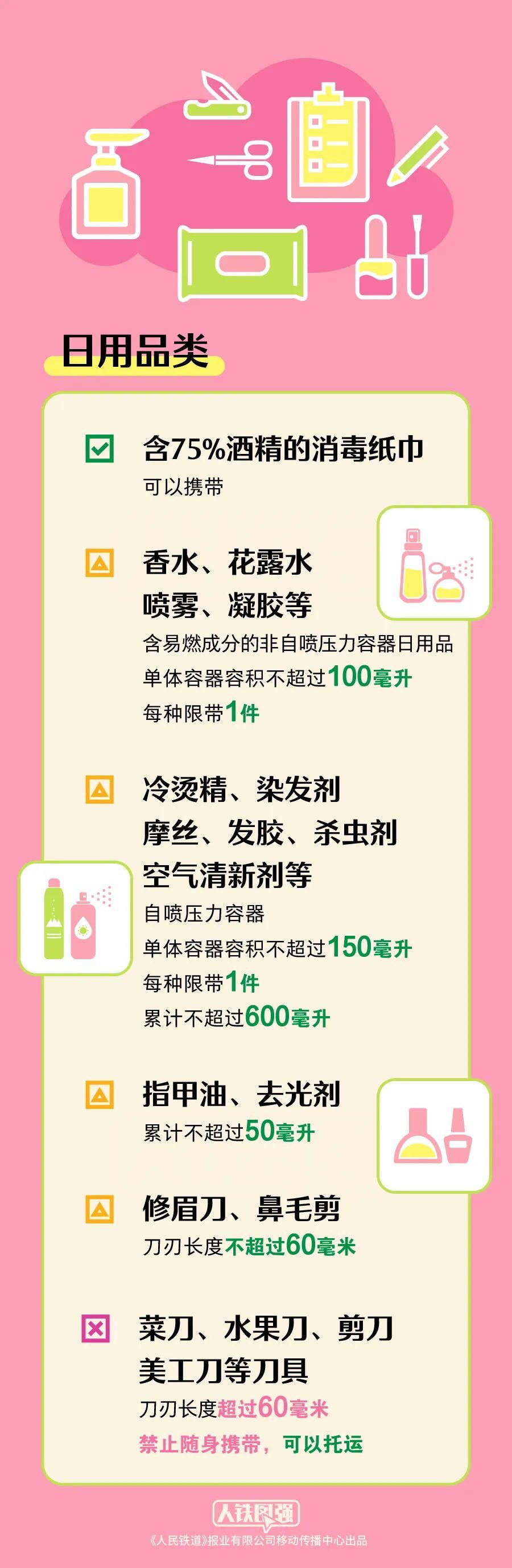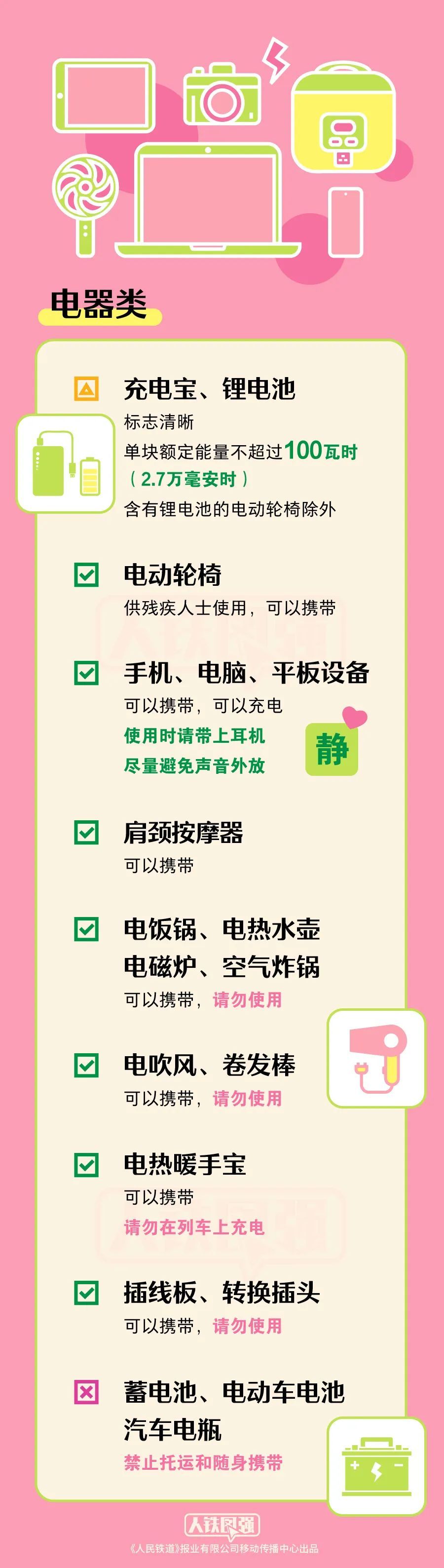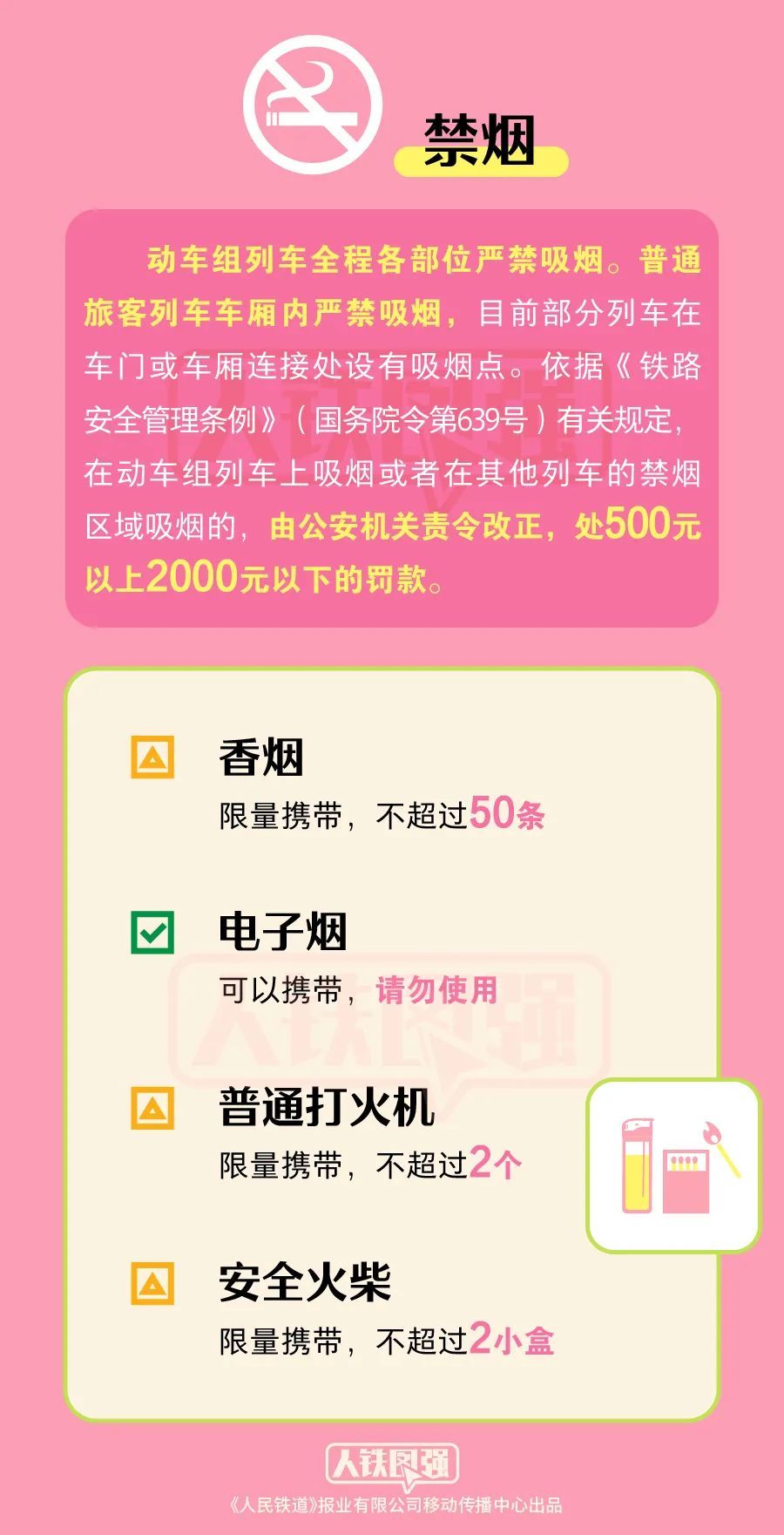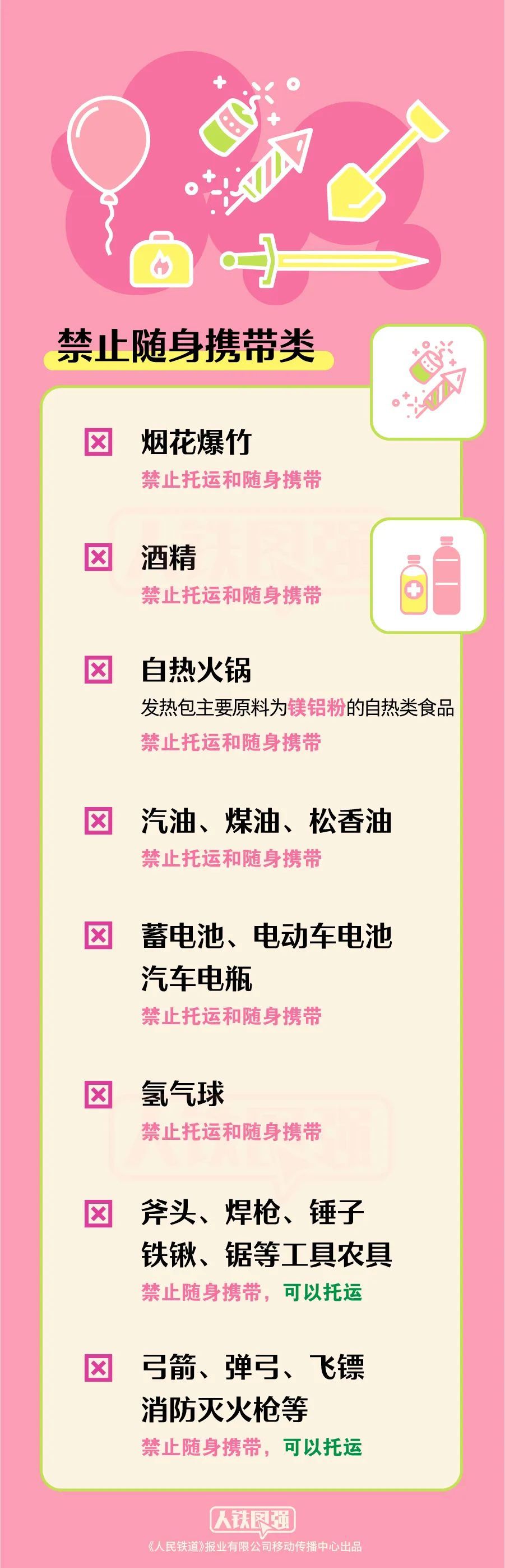 鞭炮能带上高铁吗?小猫小狗能坐火车吗?白酒、香烟限量吗?电饭煲能在车上使用吗……国铁集团帮大家列出了火车携带品注意清单,回家过年的小伙伴请注意,出发前赶快筛查行李单,以防有些物品可能过不了安检。详见↓