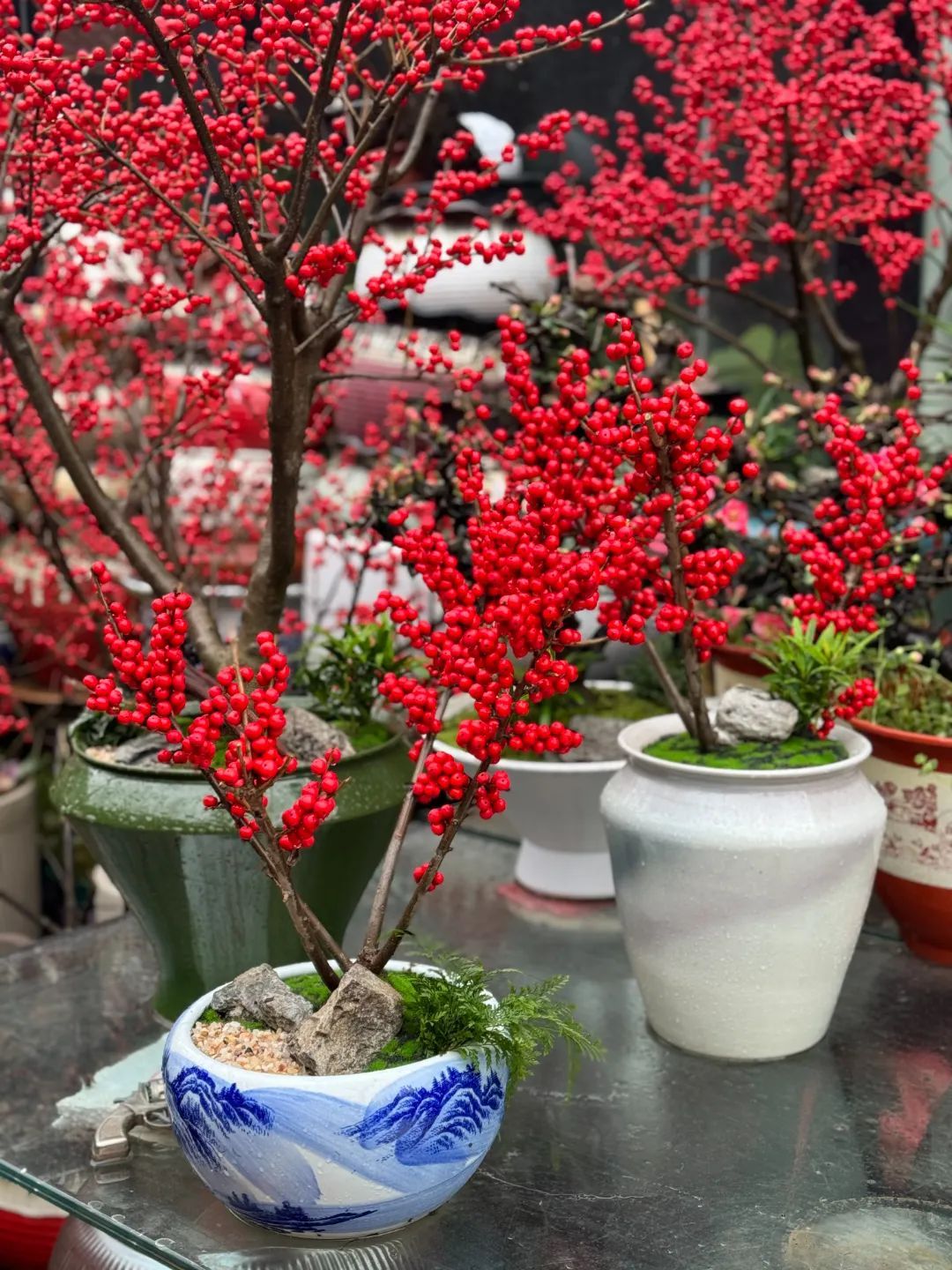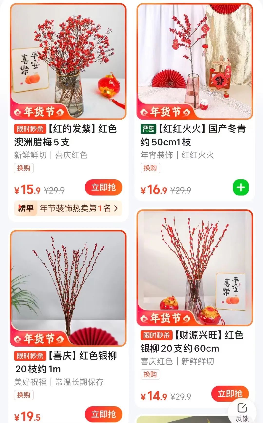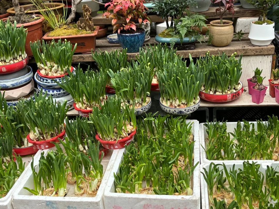 除兰花以外,水仙、金桔、杜鹃、北美冬青、银柳等年味十足的经典款年宵花今年依旧畅销。北美冬青又名轮生冬青,色彩温暖炽热,一簇簇饱满圆润的红果子如宝珠,点缀在挂着福牌的枝头,颇显喜庆与温馨;小巧可爱的金桔则掩映在绿叶之间,挂满果子的盆栽看起来满树金黄,寓意金玉满堂,十分喜气洋洋;尚未开放的水仙,此时一朵朵看着还十分像蒜苗,但用不了多久,它就会展翠吐芳,家养一盆水仙花,节日的气氛更浓郁。