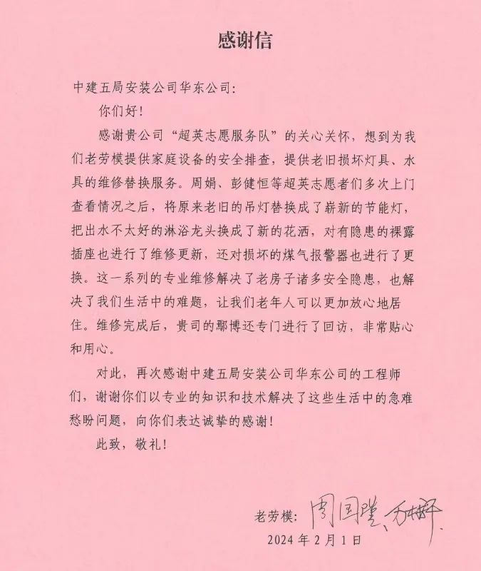 “尽管双眼近乎失明,但每次只要一听声音,我就知道是你们来了。”上海市劳动模范杜少帆老先生在他的感谢信中这样写道,“你们的声音我非常熟悉,因为,今年已经是你们来帮助我的第5个年头。”杜先生信中所说的就是跟他同属一个街道的中建五局安装公司华东公司的志愿者,7年来,他们义务帮助残疾人杜老夫妇改造老旧房屋,送去节日慰问,为他们营造了一个安全舒适的居家环境。