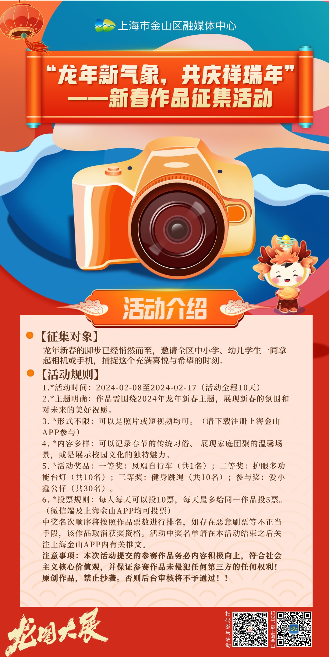 龙年大吉千家喜,春色满园万象新。春节期间,上海金山APP推出“龙年新气象,共庆祥瑞年”——新春作品征集,邀请全区中小学、幼儿学生一同拿起相机或手机,捕捉这个充满喜悦与希望的时刻。 一、活动时间:2024-02-08至2024-02-17(活动全程10天) 二、活动须知:龙年新春的脚步已经悄然而至,邀请全区中小学、幼儿学生一同拿起相机或手机,捕捉这个充满喜悦与希望的时刻。 1. 活动主题明确:作品需围绕2024年龙年新春主题,展现新春的氛围和对未来的美好祝愿。 2. 征集形式不限:可以是照片或短视频均可。 3. 作品内容多样:可以记录春节的传统习俗、展现家庭团聚的温馨场景,或是展示校园文化的独特魅力。 三、活动奖品:一等奖:凤凰自行车(共1名);二等奖:护眼多功能台灯(共10名);三等奖:健身跳绳(共10名);参与奖:爱小鑫公仔(共30名)。 四、投票规则:每人每天可以投10票,每天最多给同一作品投5票。中奖名次顺序将按照作品票数进行排名,如存在恶意刷票等不正当手段,该作品取消获奖资格。活动中奖名单请在本活动结束之后关注上海金山APP内有关推文。 五、注意事项:本次活动提交的参赛作品务必内容积极向上,符合社会主义核心价值观,并保证参赛作品未侵犯任何第三方的任何权利。原创作品,禁止抄袭。否则后台审核将不予通过。