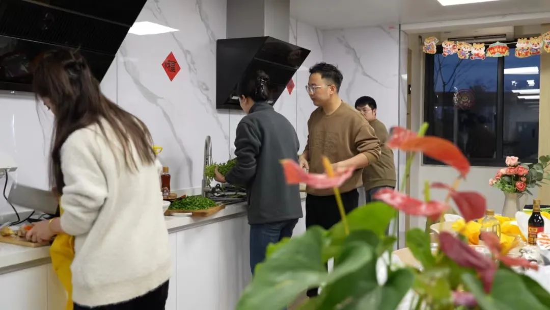 在共享厨房里,墙面上挂上了春节拉花,“福”字贴得满满当当,整个房间内瞬间变得年味十足,变成了一个温馨的“家”。这些住在社区里的青年大多20岁出头,洗菜、切菜、起锅烧油……动作麻利,宛若大厨的气势。