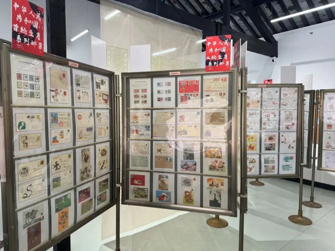走入朱家角大清邮局二楼展厅,便可看见展厅内分区排布的展板,错落排布,正反两面都展出了国内国外有关十二生肖的邮票藏品。生肖文化起源于中国,至今已拥有两千多年的悠久历史,目前,中国已经发行了四套生肖邮票,均在展厅内展出,从左至右依次观赏,就如翻开了一本厚重的生肖邮票册,一只只精美绝伦的生肖动物跃然纸上,栩栩如生。