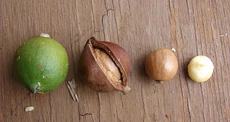 从左至右是夏威夷青果、外果皮开裂的成熟果实、去除外果皮仅余内果皮的果实、果仁,图源:Public Domain,Wikimedia Commons