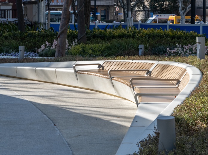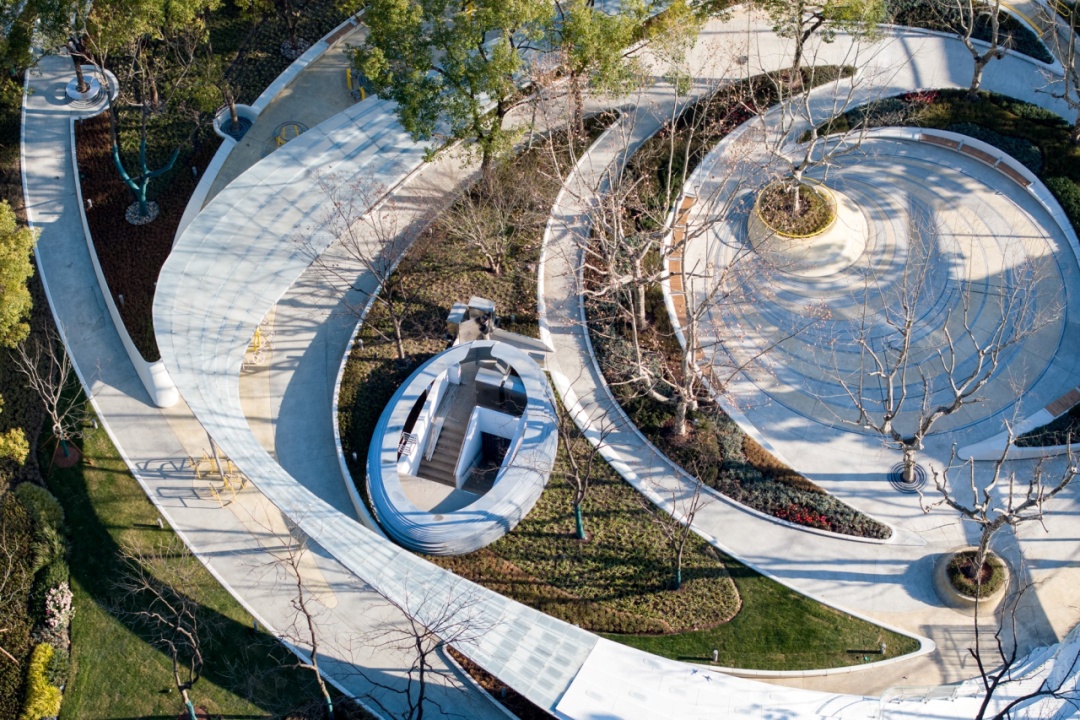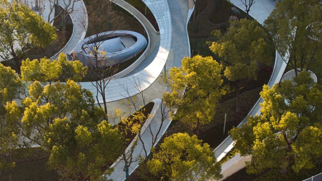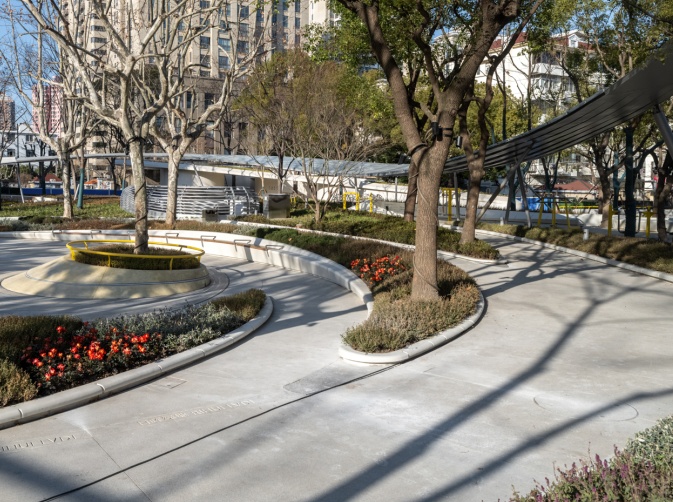 在环保设计方面,绿地内采用了可再生材料——砾石聚合物进行铺装,与传统石材铺装相比可减碳33%。还增加了光伏板发电,每日可发电8~10度。通过增设智慧园林养护系统、节水灌溉等措施,实现了节水44%和节电78%。