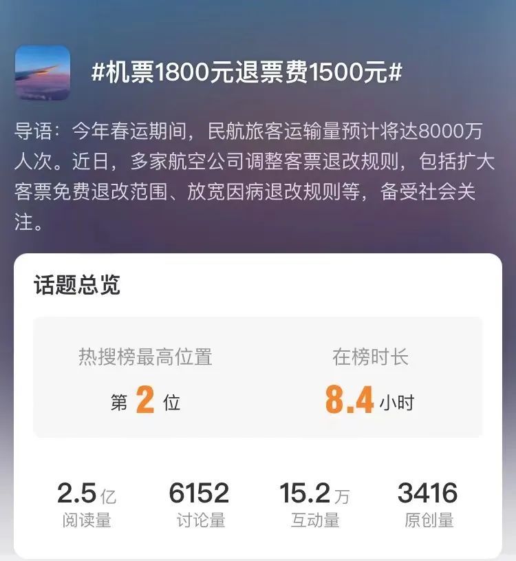 春节临近,不少人已经踏上了归乡或出游的旅途。今年春运期间,民航旅客运输量预计将达8000万人次,与此同时,机票退改签难题也引发了关注。 近日,一则“机票1800元,退票费却要1500元”的新闻冲上了热搜。 据该新闻报道,一名旅客投诉称,她将1月13日从墨尔本飞上海的南航机票错买成了1月30日的,并在1月1日联系航空公司要求退票。尽管此时距离起飞日期还有一个月,但航空公司仍要收取该旅客约1500元的退票费,而她的机票价格仅为1800人民币。后续,该名旅客选择了改签,但依然支付了960元的高额改签费。