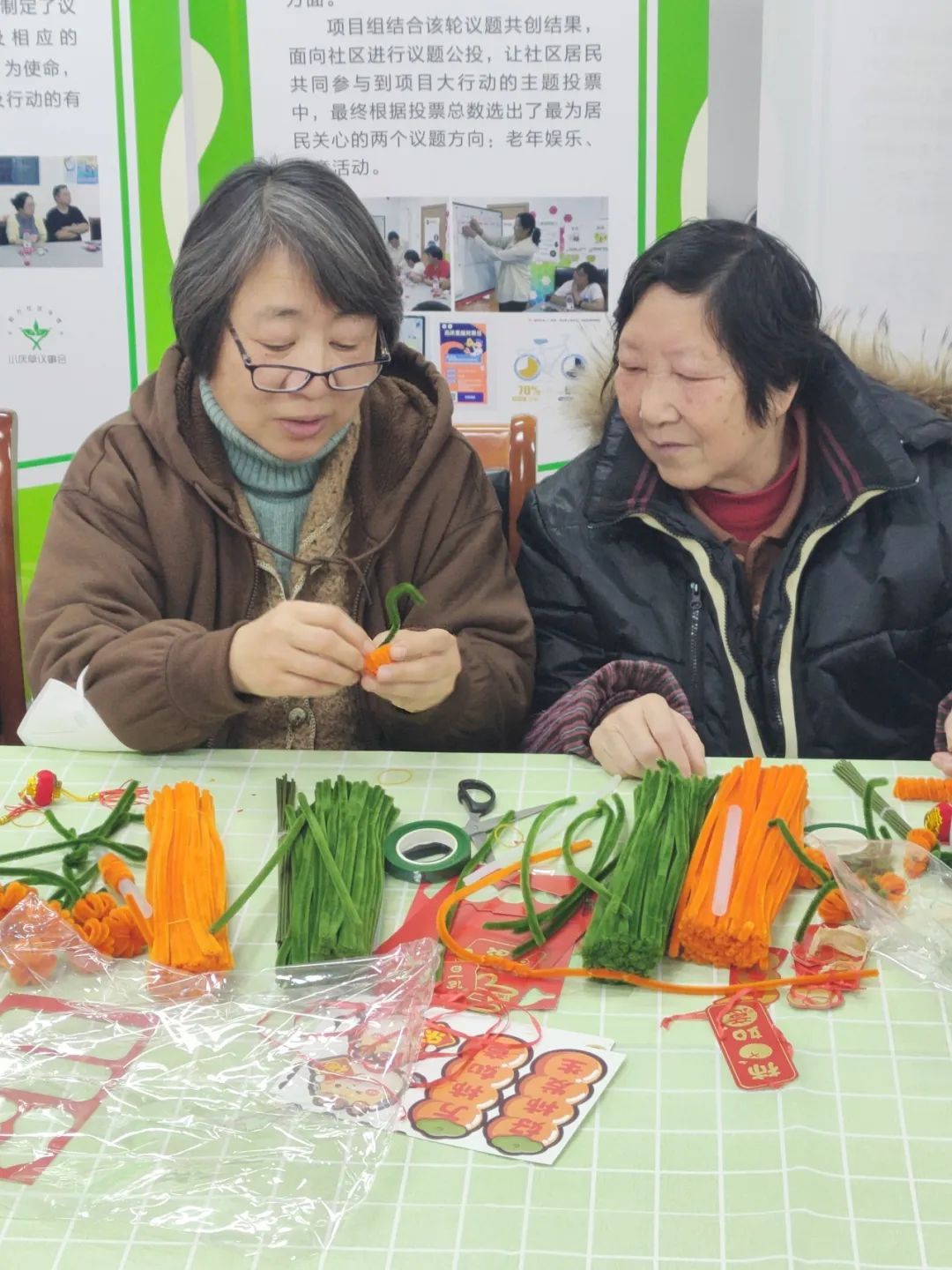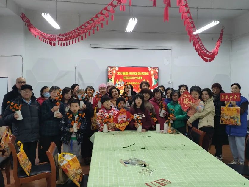 高寿里居民区开展“龙行龘龘,柿柿如意”文明实践活动,近30名天东小区居民欢聚一堂,度过了一段暖意融融的欢乐时光。“扭扭棒”又被称为仿绒花条,绒花制作始于唐代。“绒花”谐音“荣华”,寓有吉祥祝福,福气满门,财气满屋,幸福满满之意。在新年来临之际,做一束“龙行龘龘,柿柿如意”花束,既是为新年讨个好彩头,又是为新年的到来增添祥和喜庆的气氛。