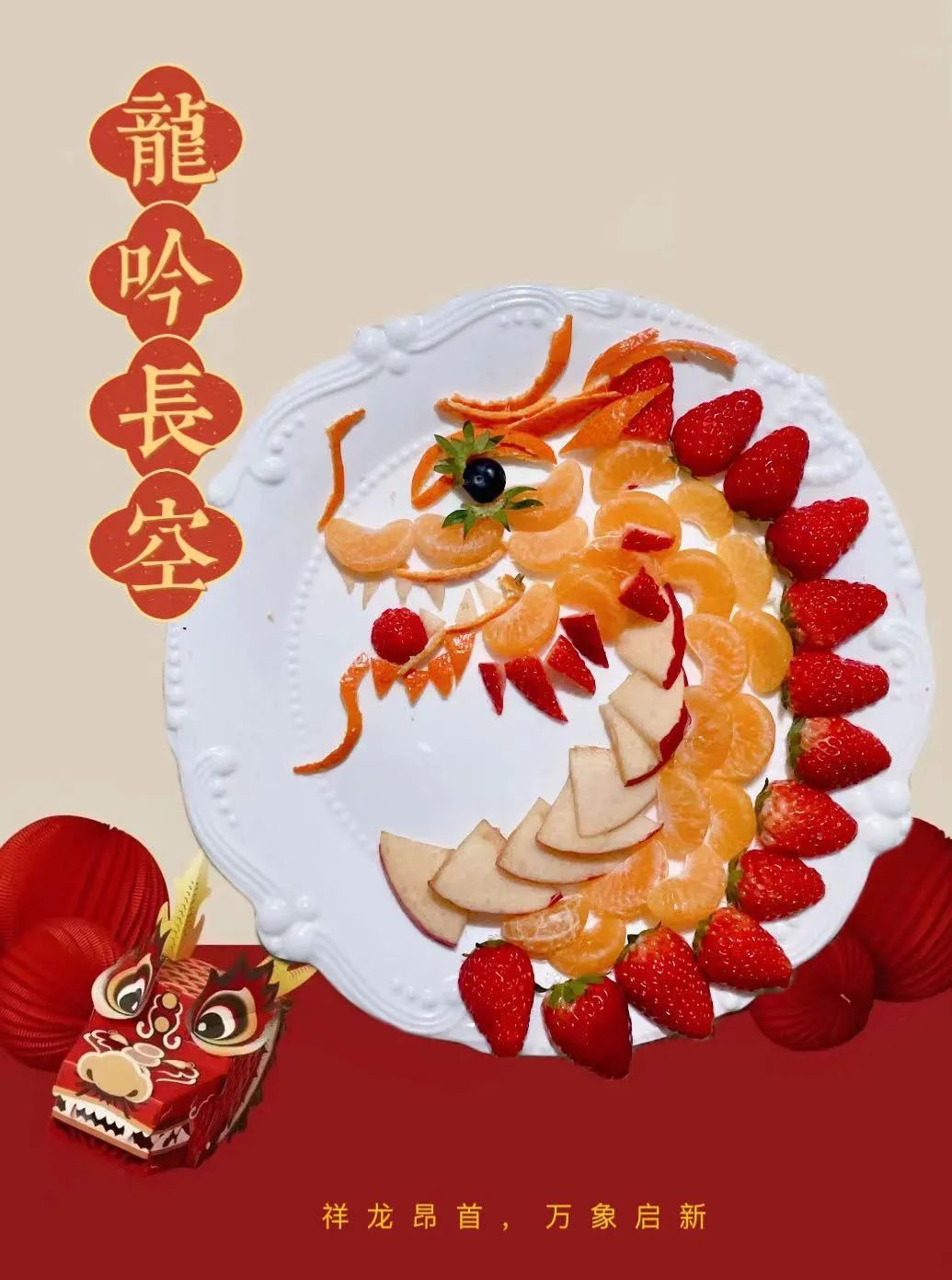 最后,用橘子、草莓、苹果摆出一条祥龙,
