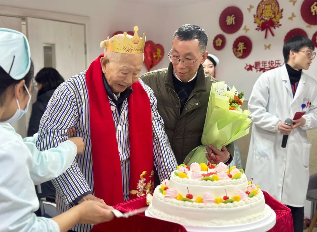 “祝你生日快乐,祝你生日快乐……”欢乐的歌声在病房里响起,让百岁老人荣盘根又惊又喜。只见他头戴着生日帽,高兴地收获着家属、病友以及医护人员的祝福。原来,医护人员得知老人即将满百岁后,悄悄为他定好了生日蛋糕、准备了鲜花,并通知他的家属来到医院。