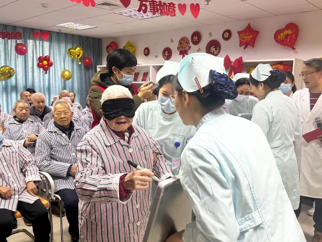 除了给老人过生日,医护人员还将病区装扮一新,挂灯笼、贴对联,处处洋溢着迎接新春的喜悦。活动上,在医护人员的组织下,老小孩们玩起了钓福气、沾喜气等小游戏。