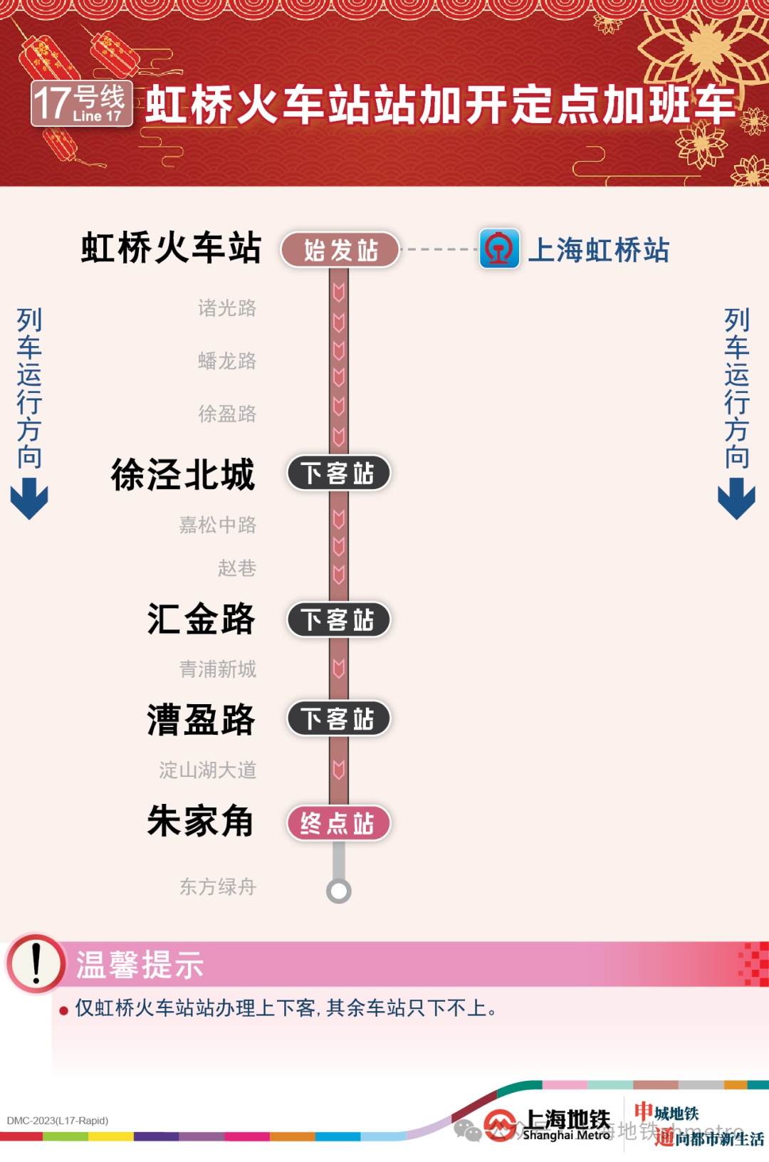 为提升春节返程期间虹桥枢纽夜间疏散能力,根据计划,2月16日、17日(周五、周六)连续两天,地铁17号线虹桥火车站站往朱家角站方向将加开定点加班车:虹桥火车站站下行末班车(23:00)后加开2列定点加班车,虹桥火车站站发点分别为23:15、23:30。加班车沿途仅停靠虹桥火车站站、徐泾北城站、汇金路站、漕盈路站、朱家角站(终到站),其余车站跳停。停靠车站中,虹桥火车站站(始发站)办理上客,其余车站只下不上。
