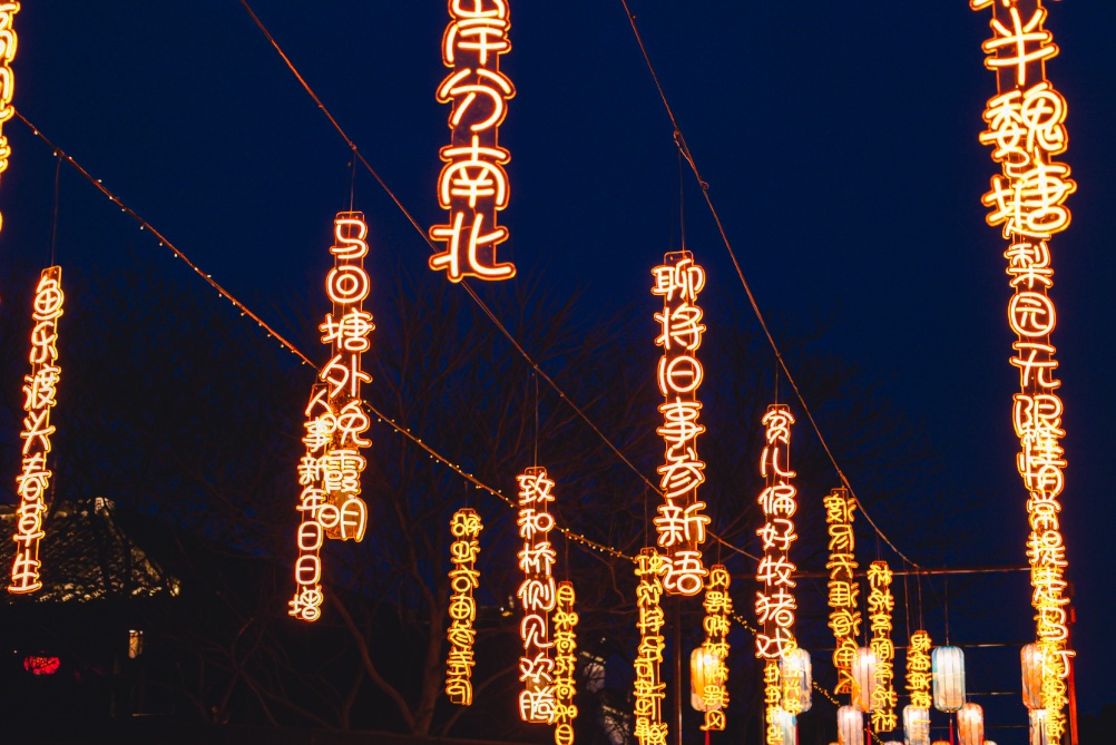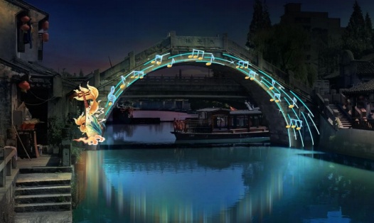当现代灯彩邂逅千年古桥,会碰撞出怎样的火花?在泰平桥,一道“音符”划过平静的市河,让水面流光溢彩。在这里,以“琴韵枫泾”为主题的灯彩,通过琵琶、音符等元素进行组合装饰,展现出江南琴韵之美。让市民游客在浏览完古镇绚丽的各式灯彩后,放慢脚步,去慢慢体验悠闲惬意的节日时光。