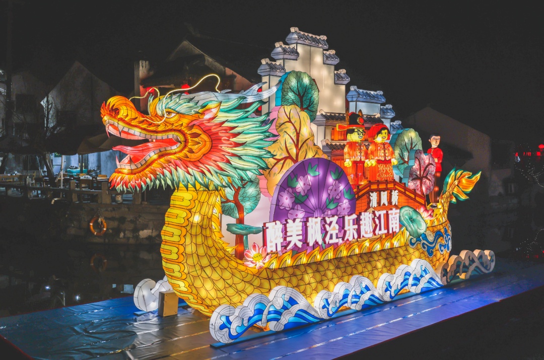 在古镇三桥广场水面,今年灯会的最大灯彩装置“龙行枫泾”彩船正停泊在市河中央。彩船灯组由龙头、龙身、房屋、桥梁等部分拼接组装而成,长度达到了10米、高5米。随着规律闪动的灯光,与真实的水面融为一体,高低起伏,浪花翻涌间,龙身游走,仿佛携江水而来,带给所有游客龙年的福气。