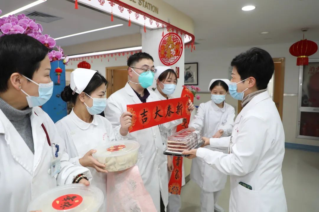 除了水饺,医院还准备了寓意美满喜庆的蛋糕和寄托美好愿望的春联。随着一盘盘热气腾腾的饺子出锅,医院党政领导班子和工会干部来到各个病区,将新春祝福和美味水饺送到正在值班的医务人员手中。