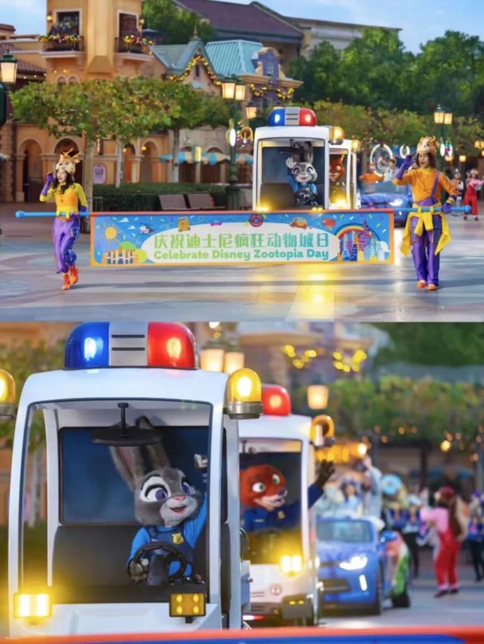迪士尼疯狂动物城日特别巡游同样精彩!在白天最热闹的巡游时刻,朱迪和尼克驾驶着警车领航。工作人员还会在人群中选择幸运儿当选“疯狂动物城荣誉居民”,穿上特制的马甲,挥舞“甜甜圈”,跟着花车一起跳舞,快乐加倍!