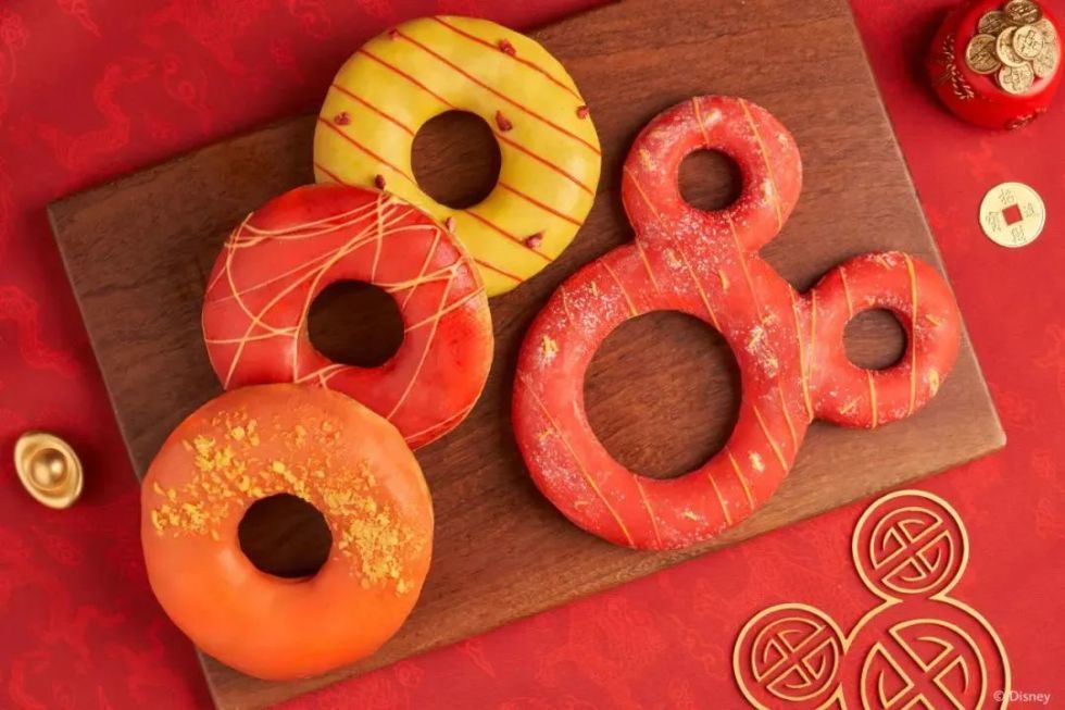 还有更多特色美食遍布在度假区内,比如创意甜品、新年甜甜圈、龙年特色的特饮杯和爆米花桶。