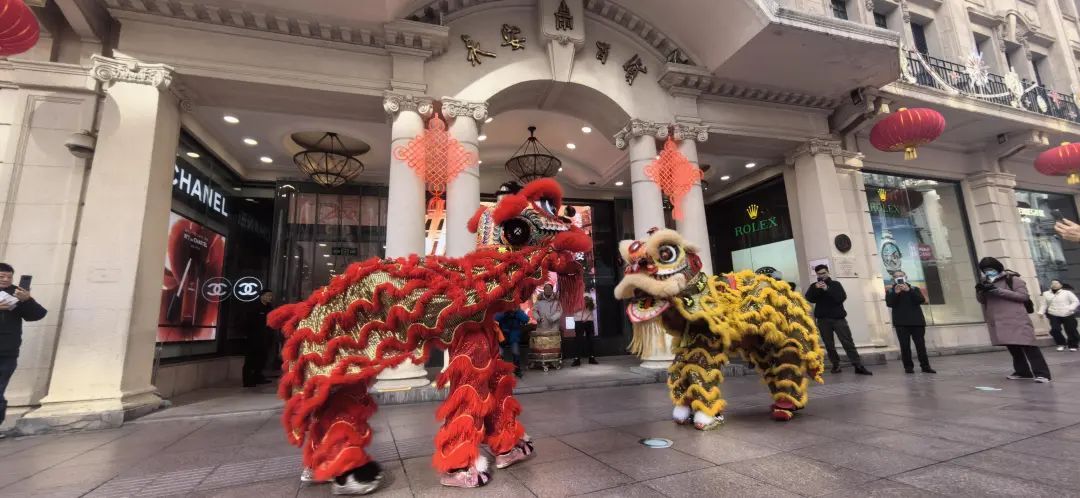 南京路步行街大年初一有舞龙舞狮的传统,已经成为迎接新年的标志性仪式。新春佳节来临之际,南京路步行街上的各商家也是做足了文章,第一百货商业中心从初一到初三安排了小丑互动、舞蹈表演、吉他歌手表演、魔术互动和鼓乐表演等多种文化项目,为市民游客购物时营造了浓浓的节日氛围。