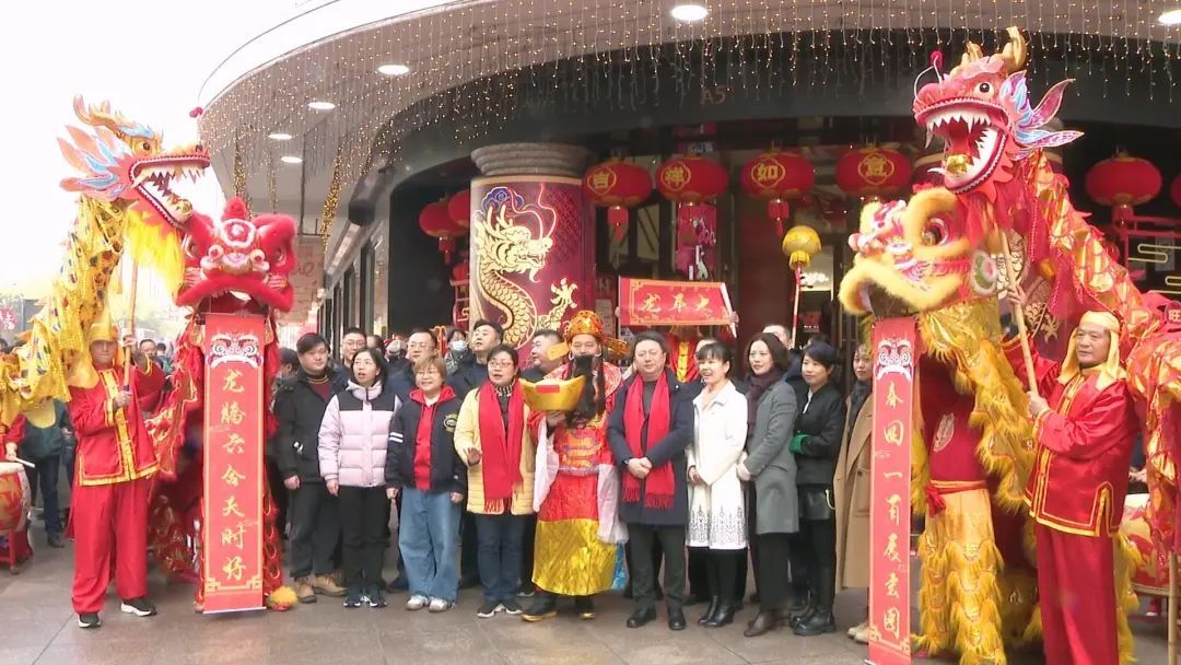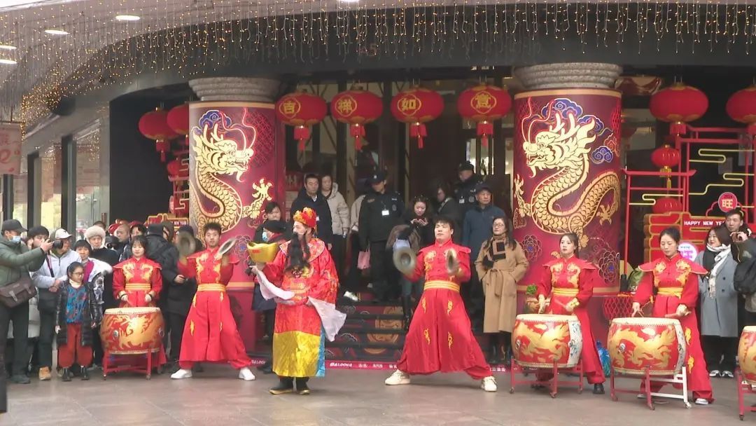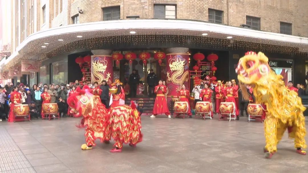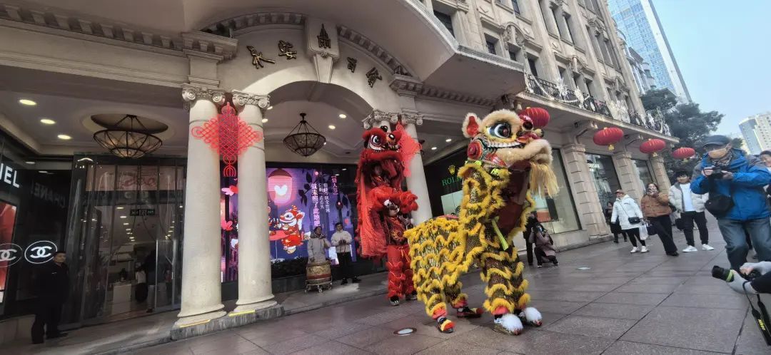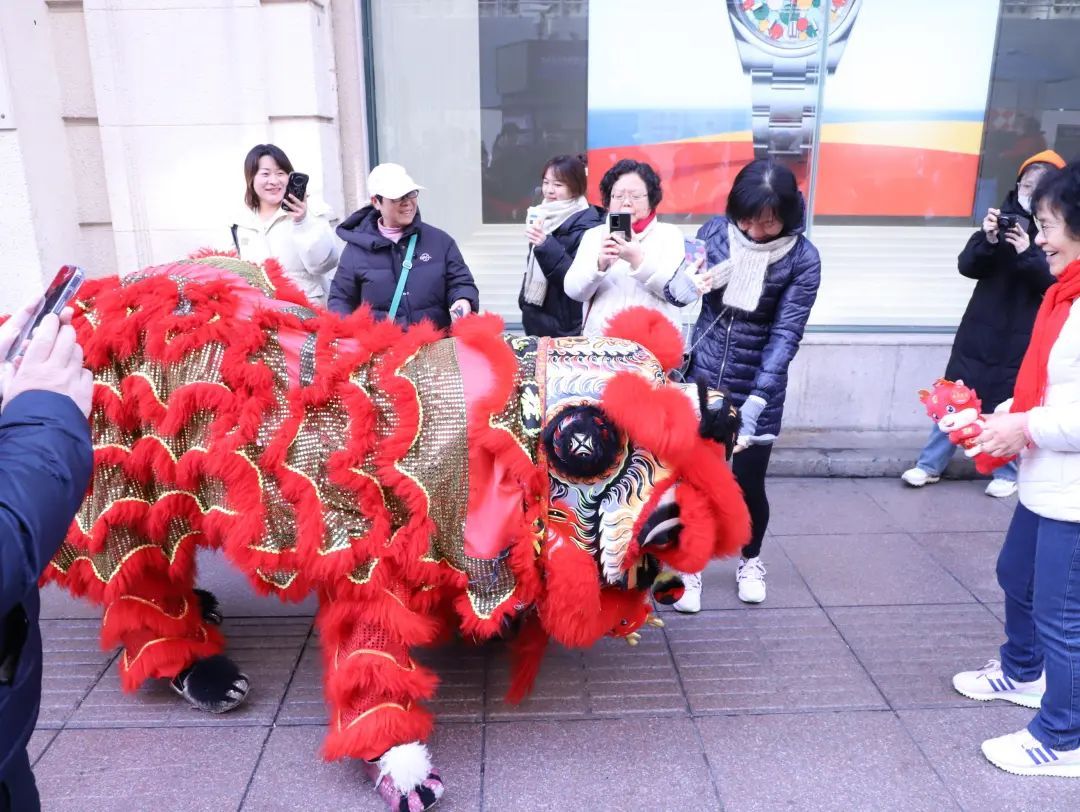 上午9点半,在第一百货商业中心前,伴随着喜庆的锣鼓,两条巨龙在空中飞舞,时而游走,时而翻腾,把天地间的喜悦展现得淋漓尽致。两只活泼可爱的狮子时而嬉戏,时而追逐,展现了满满的快乐和幸福。龙狮交汇,热闹欢快的氛围传递出浓浓的年味儿,引得观众喝彩不断。