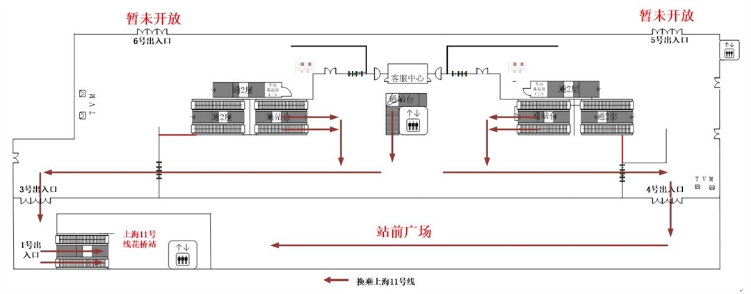 方式二:通过出站闸机后,从3号口、4号口出站,至上海花桥站1号口进站换乘。