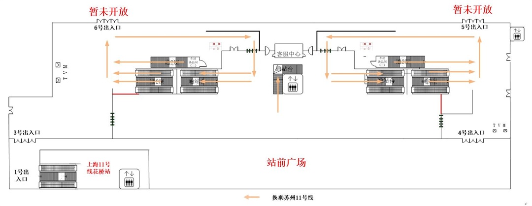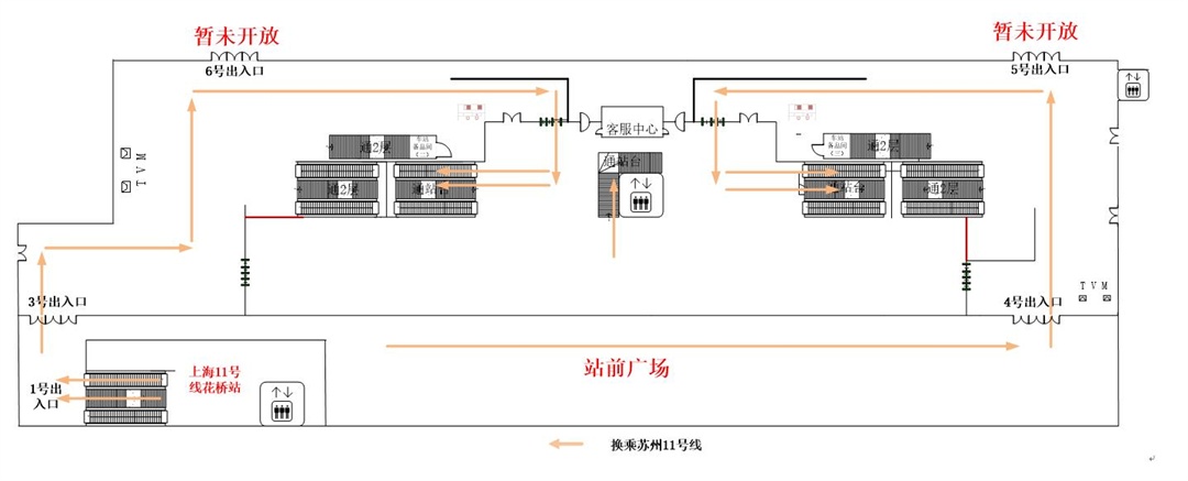方式二:通过出站闸机后,从1号口出站后,至苏州花桥站3号口、4号口进站换乘。