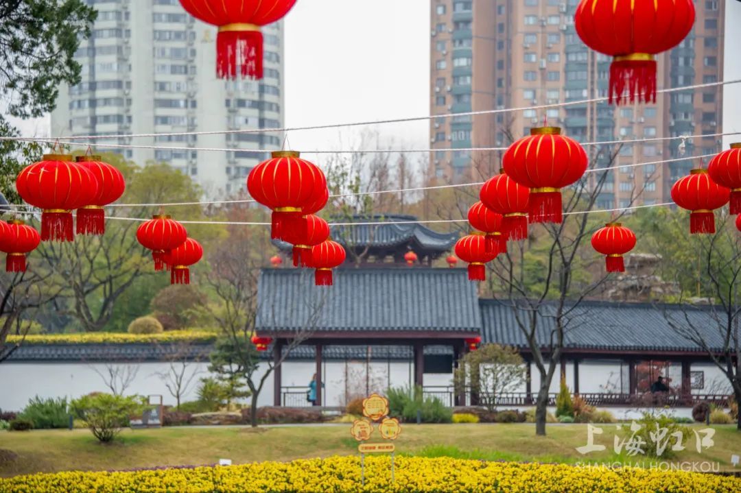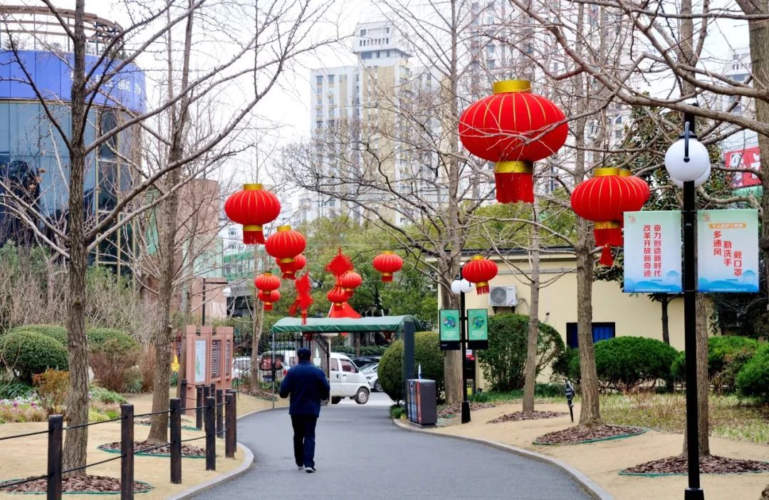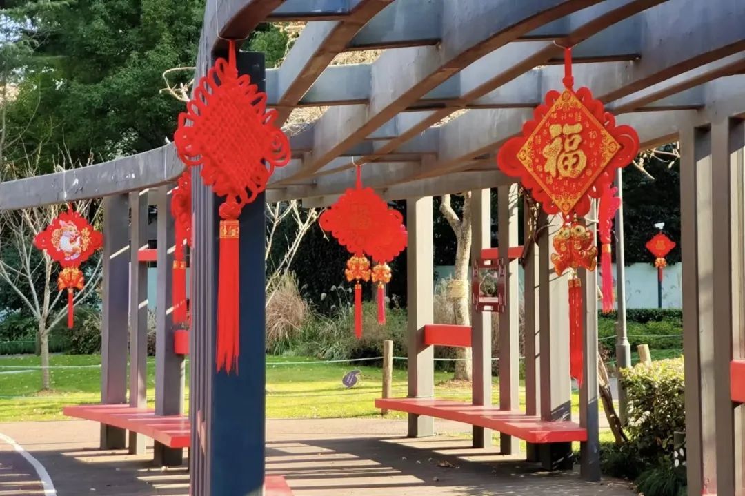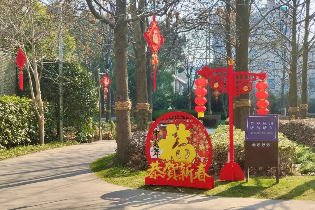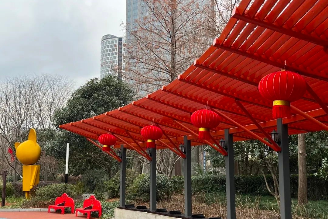 公园的其他地方,红灯笼高高挂起,与绿意盎然的树木相映成趣,为公园增添了独特的节庆色彩。
