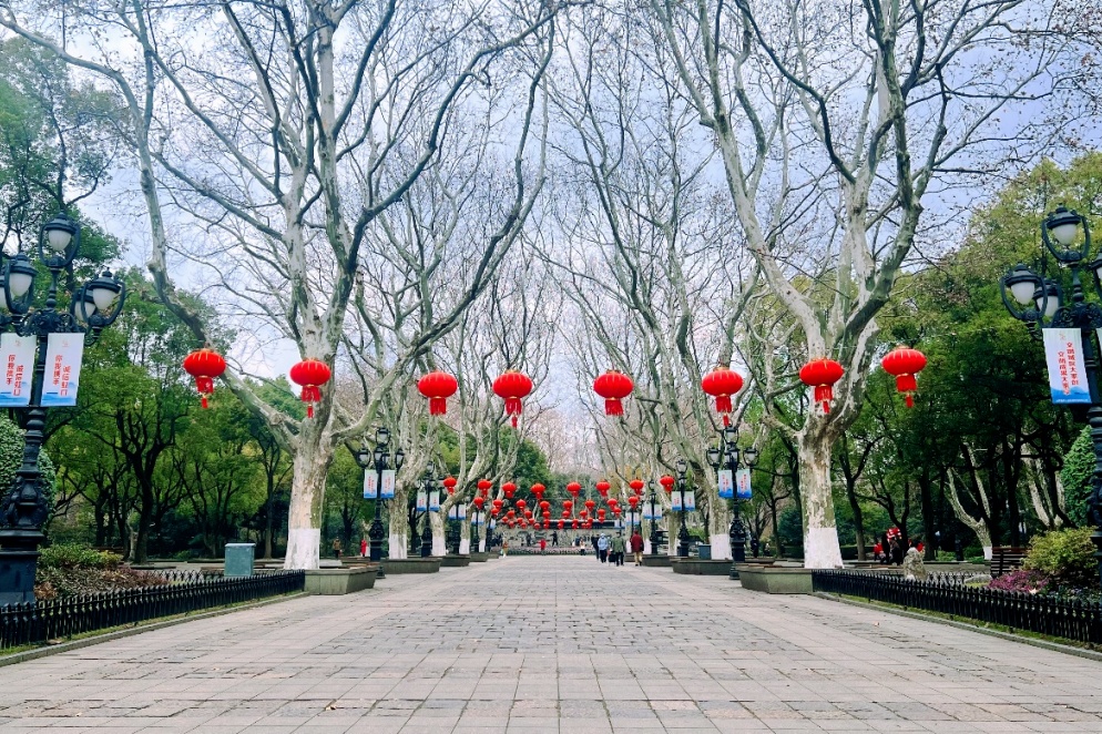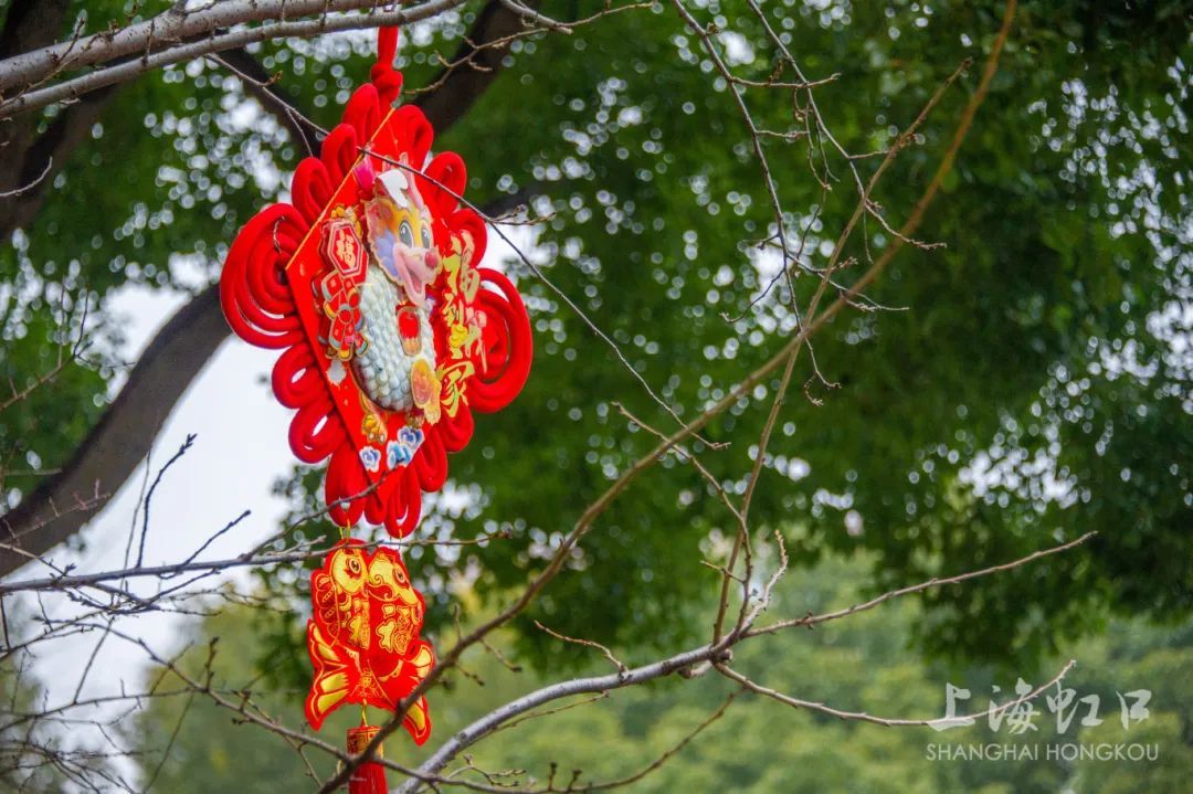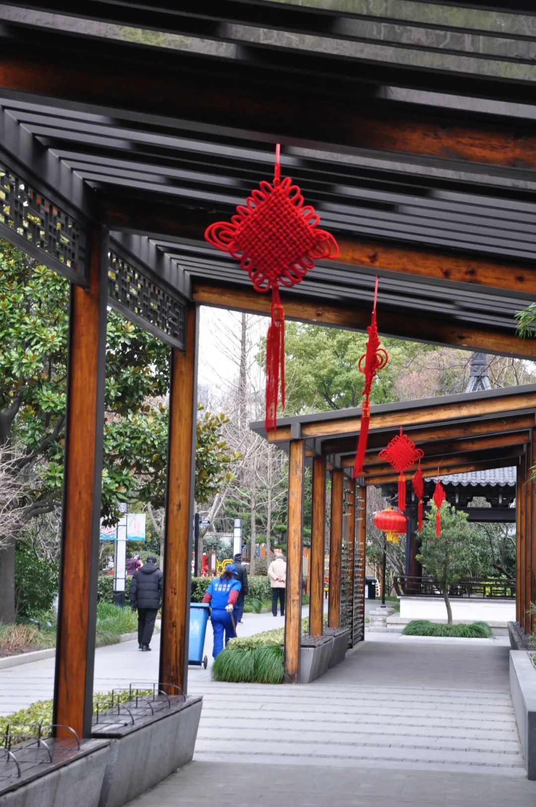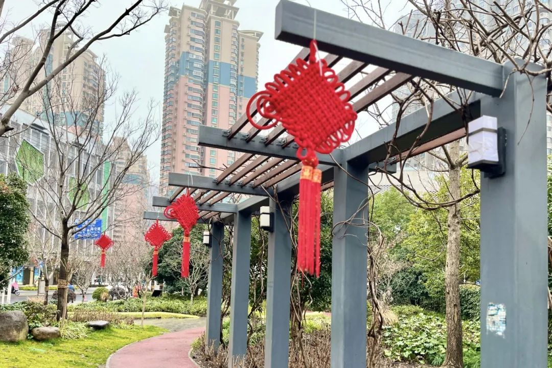 公园的其他地方,红灯笼高高挂起,与绿意盎然的树木相映成趣,为公园增添了独特的节庆色彩。