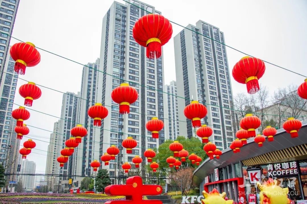 挂上了红灯笼、中国结、福字、对联等