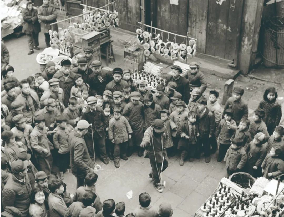 1950年代春节期间的上海街头,人们围观扯铃表演