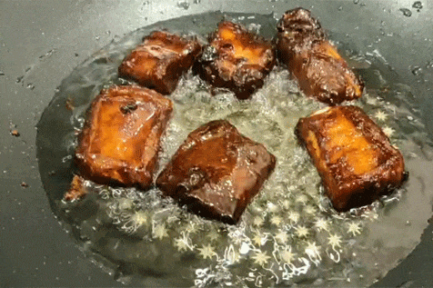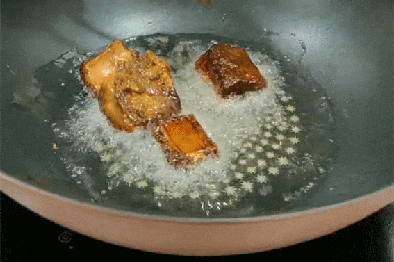 1.热锅、冷油第一次下锅煎,煎至变色即可;