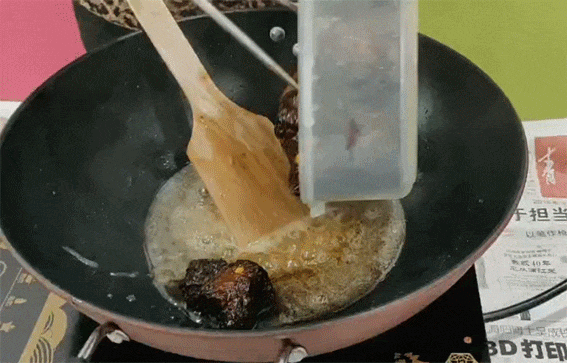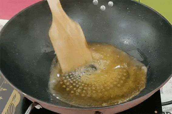 3.加入醋、糖,熬制均匀即可,在熬制糖色的时候,时间不宜过长,颜色稍有变化就应及时放入小排,否则就变成拔丝排骨了;